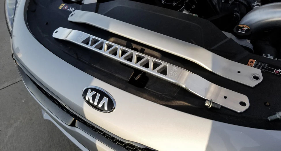 New for 2018+ KIA Stinger. Designed and made in the USA from lightweight billet aluminum with the BMS logo engraved on top and bottom. These strut braces are a solid one-piece design, CNC milled out of s solid block of billet aluminum, unlike the factory units which are flattened hollow tubes.