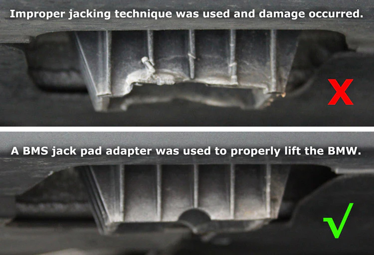 Simple to use. Just place the BMS jack pad adapter on your floor jack, align with the factory jack pad under the car and lift the car correctly, securely and perfectly every time. Our jack pad also comes down when the jack is lowered so you don’t have to worry about forgetting it on the car.