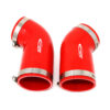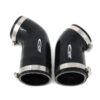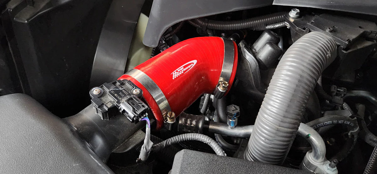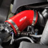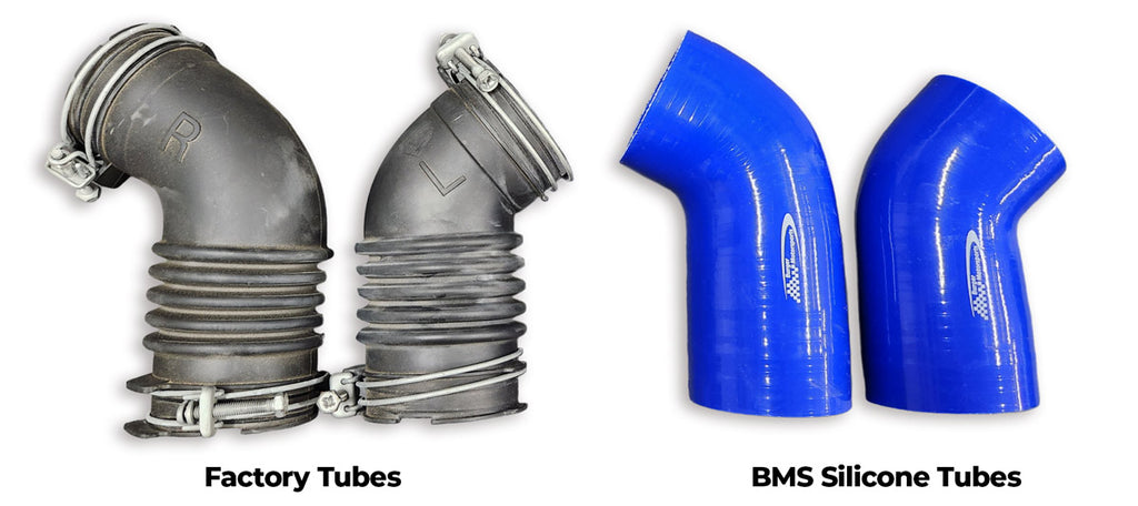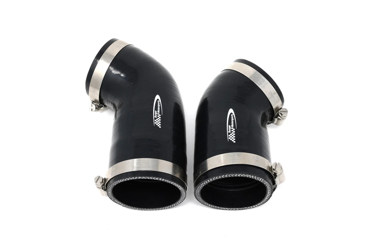 The Burger Motorsports dual silicone intake pipes upgrade for the Gen3 Tundra & Sequoia replaces the flimsy unsightly factory accordion hoses and smooths the airflow and reduces turbulence from the intake to the factory turbo inlets for better performance.