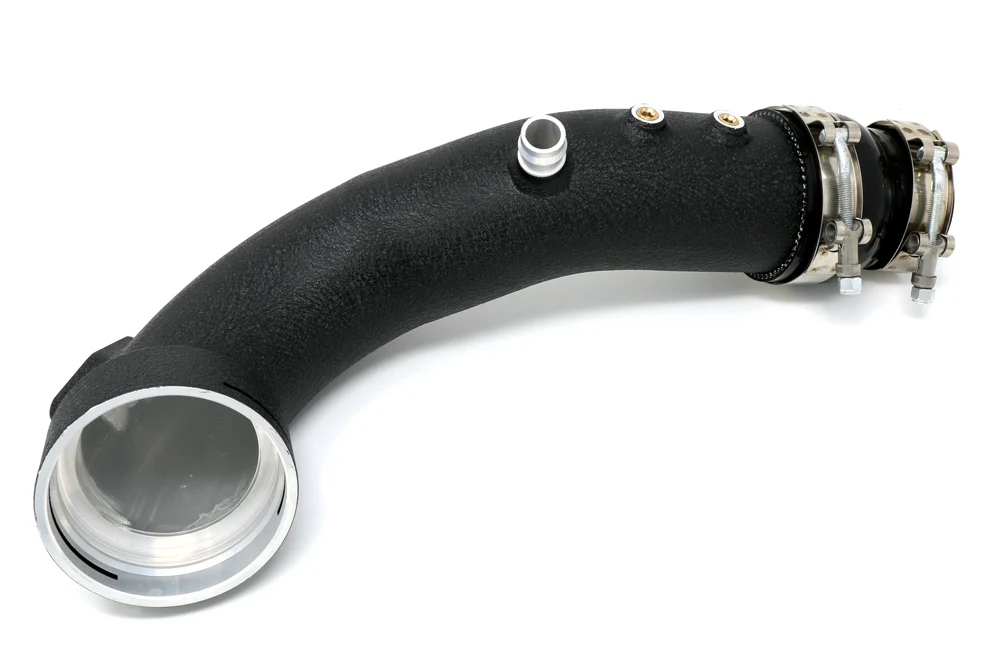 Tired of your factory plastic charge pipe blowing off or ripping apart under boost? Upgrade your flimsy OEM unit to our heavy-duty aluminum replacement for 1/3 of the price of the factory unit. Designed by Burger Motorsports and manufactured overseas our replacement charge pipe features all-aluminum construction, high-quality matte black finish, CNC machined flanges, OEM style mounting hardware for a direct fit, and a lifetime warranty. Because we use the OEM mounting system, unlike other charge pipe solutions, this charge pipe installs easily, retains all emissions fittings, and is 100% reversible. Includes two 1/8″ NPT bungs with optimal 180 degree placement. Lifetime warranty.