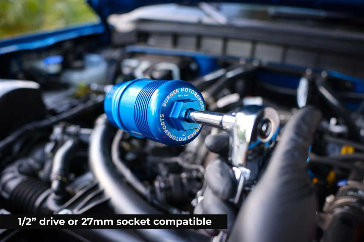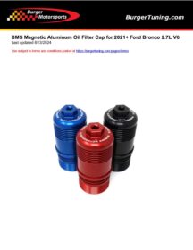 The Burger Motorsports billet aluminum magnetic Bronco oil filter cover directly replaces your weak OE plastic cap for greater protection, ease of removal/install, and great looks under the hood. You can use a 3/8″ inch drive ratchet or torque wrench to install and remove. The built-in 32mm hex head does not require a special removal/install tool like the factory cap. Uses the OE oil filter, filter housing o-ring, and filter insert. Anodized for protection. This quality part is a must for any serious Bronco owner.