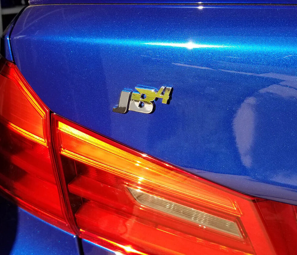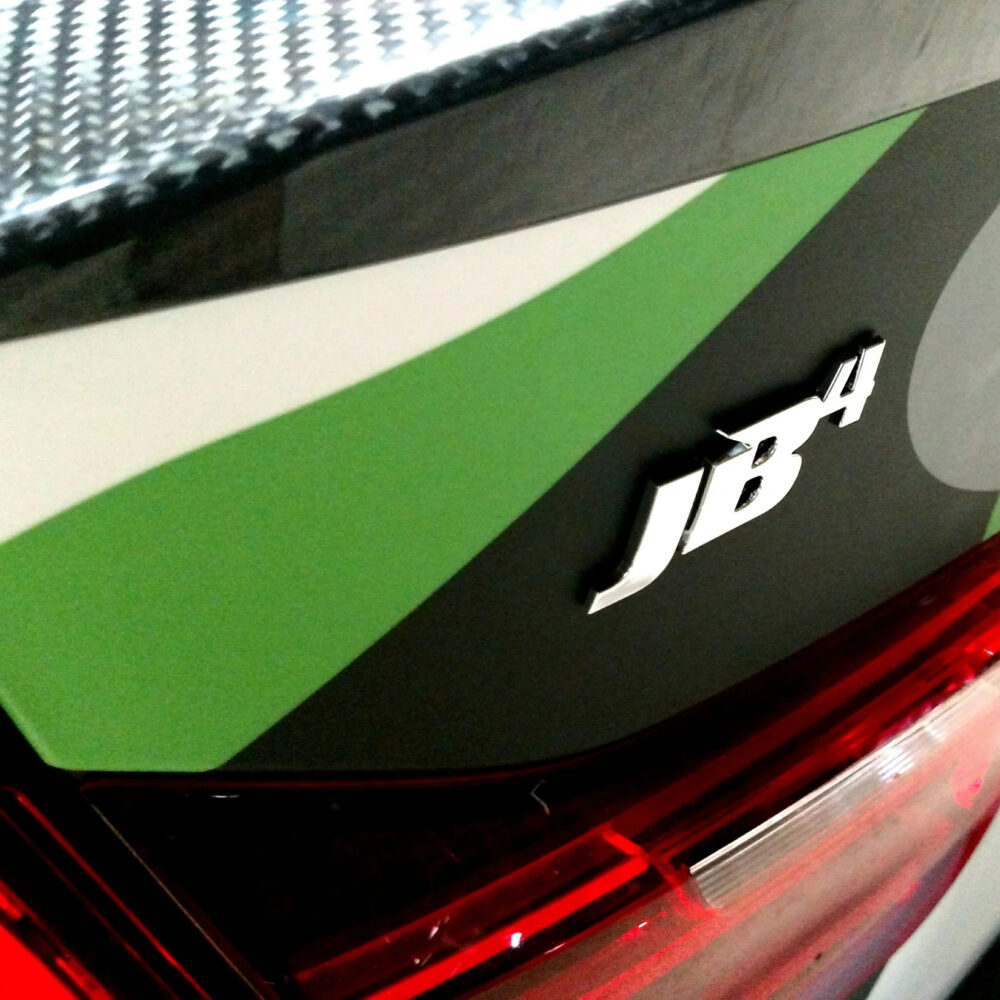 To apply: Clear film stays on until after the emblem is stuck to the surface. Make sure the mounting area is flat and not curved. Clean the area where you want to apply the emblem. Use painters/masking tape and a level to make sure it goes on straight. Carefully peel the white backing off make sure to keep the JB4 emblem attached to the clear film. The ‘J’ and the “B4″ go on at the same time. Peel the white backing off to expose the adhesive sticker. Align and lightly press on. If it’s straight press and hold for 10 seconds. Then remove the clear film.