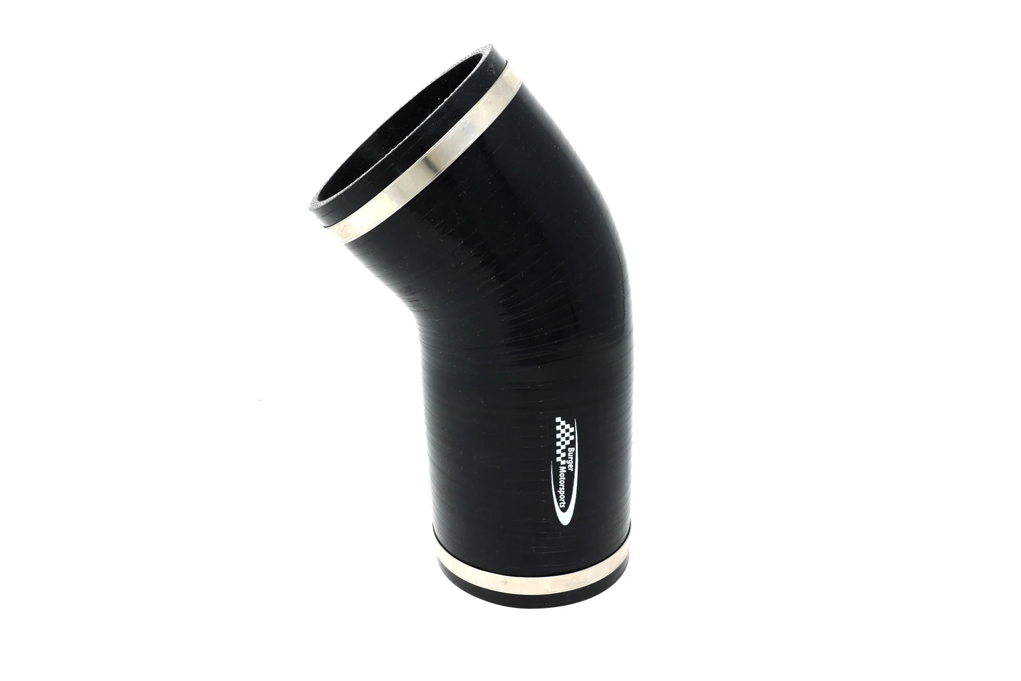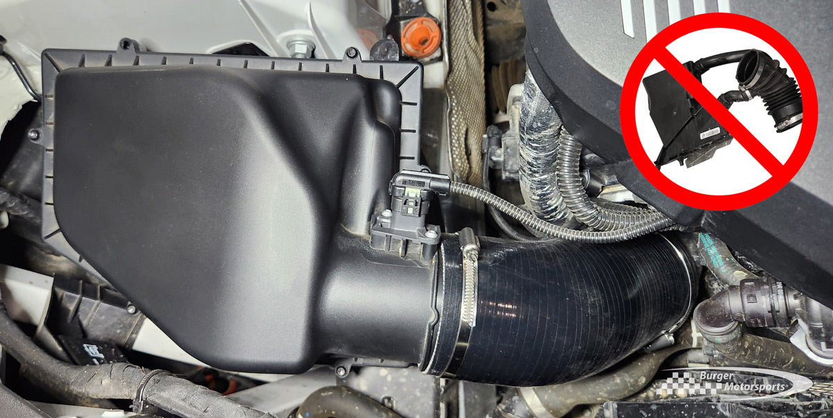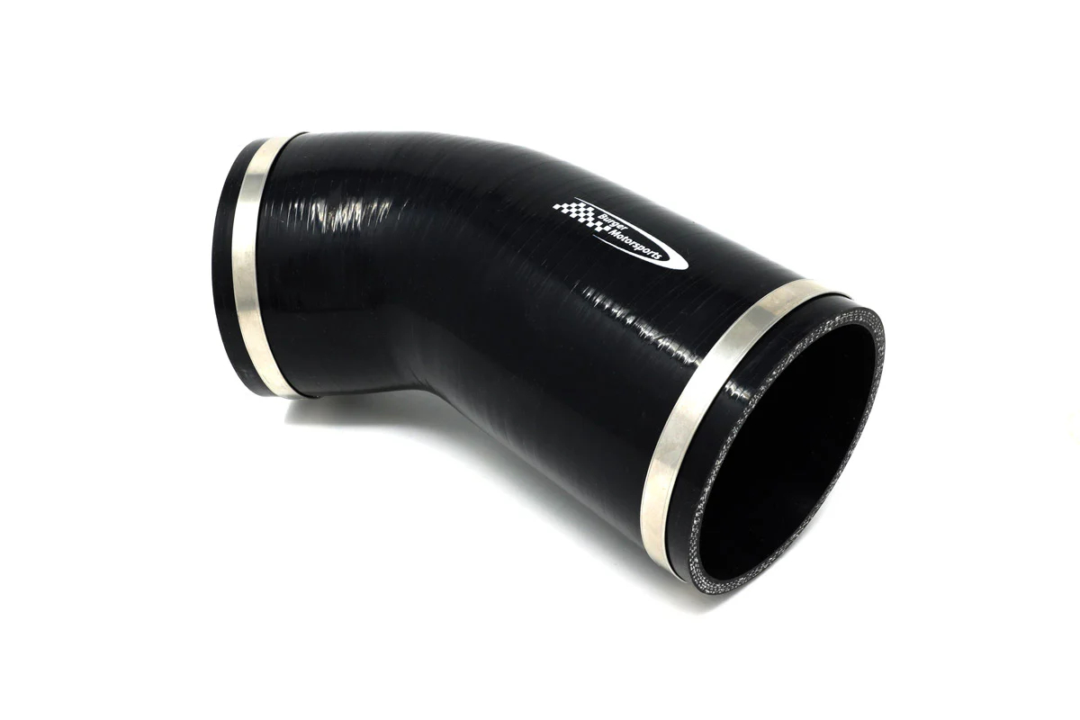 The Burger Motorsports silicone intake pipe upgrade for the B58 BMW smooths the airflow from the intake to the factory turbo inlet by removing the bulky upper factory sound resonator and the lower accordion section of the air inlet pipe.