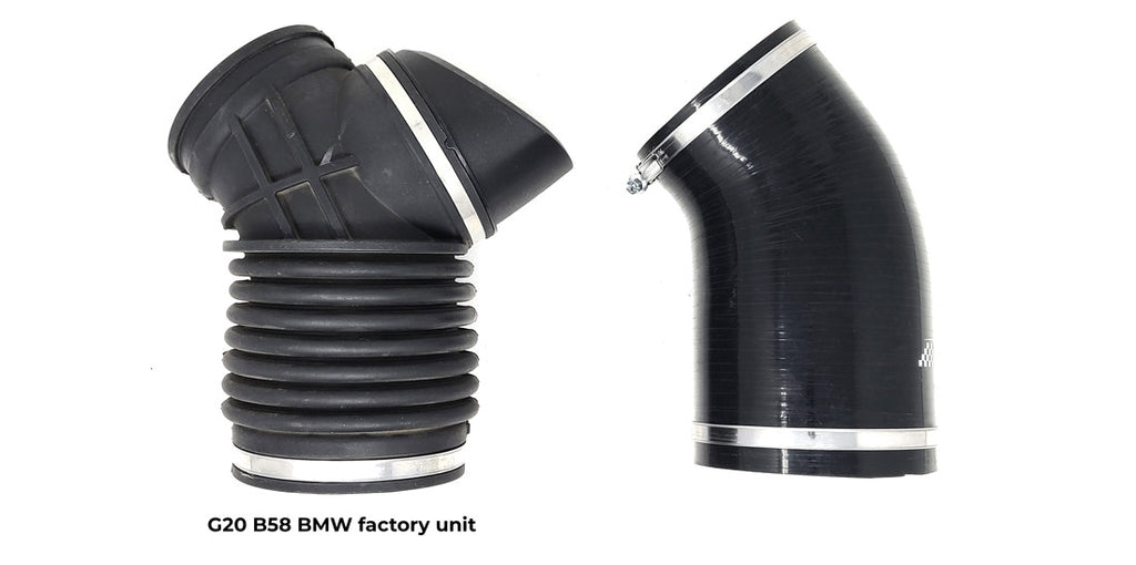 The Burger Motorsports silicone intake pipe upgrade for the GEN2 & GEN 3 B58 BMW smooths the airflow from the intake to the factory turbo inlet by removing the upper factory sound resonator and the lower accordion section of the air inlet pipe.