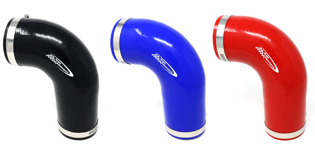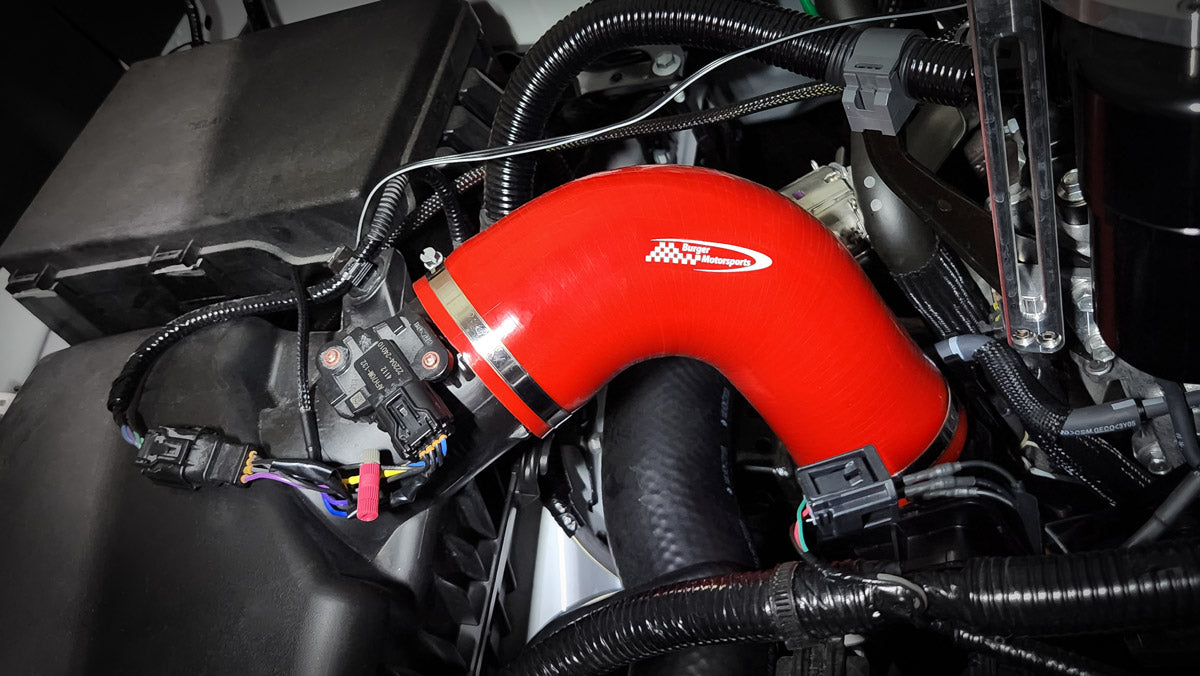 The Burger Motorsports dual silicone intake pipe upgrade for the Gen 4 Toyota Tacoma replaces the flimsy unsightly factory accordion hoses and smooths the airflow and reduces turbulence from the intake to the turbo inlets for better performance. Install in minutes.