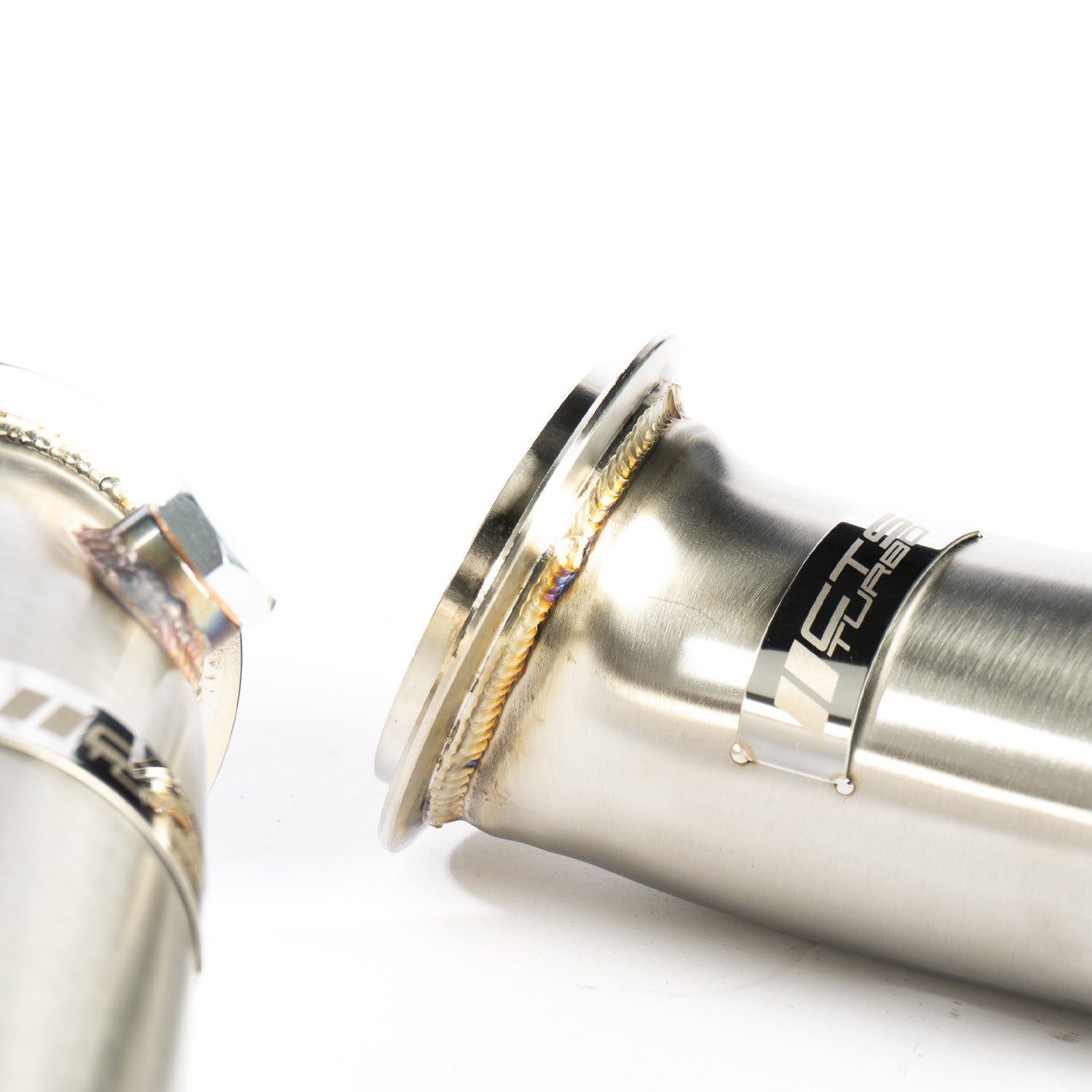 Our stainless steel high-flow downpipes allow for faster spool, better transient boost response, higher boost, and great sound. Our downpipes are the first part of our modular exhaust system and are compatible with factory mid-pipes and our upcoming CTS Turbo mid-pipes. You should expect 27whp/40ftlbs torque gains when paired with appropriate tuning software. We used CAD simulation to streamline the flow of exhaust gasses and ensure seamless integration with the factory and CTS exhaust components. Many hours of R&D were spent to ensure a perfect fit, smooth exhaust flow, and excellent sound.