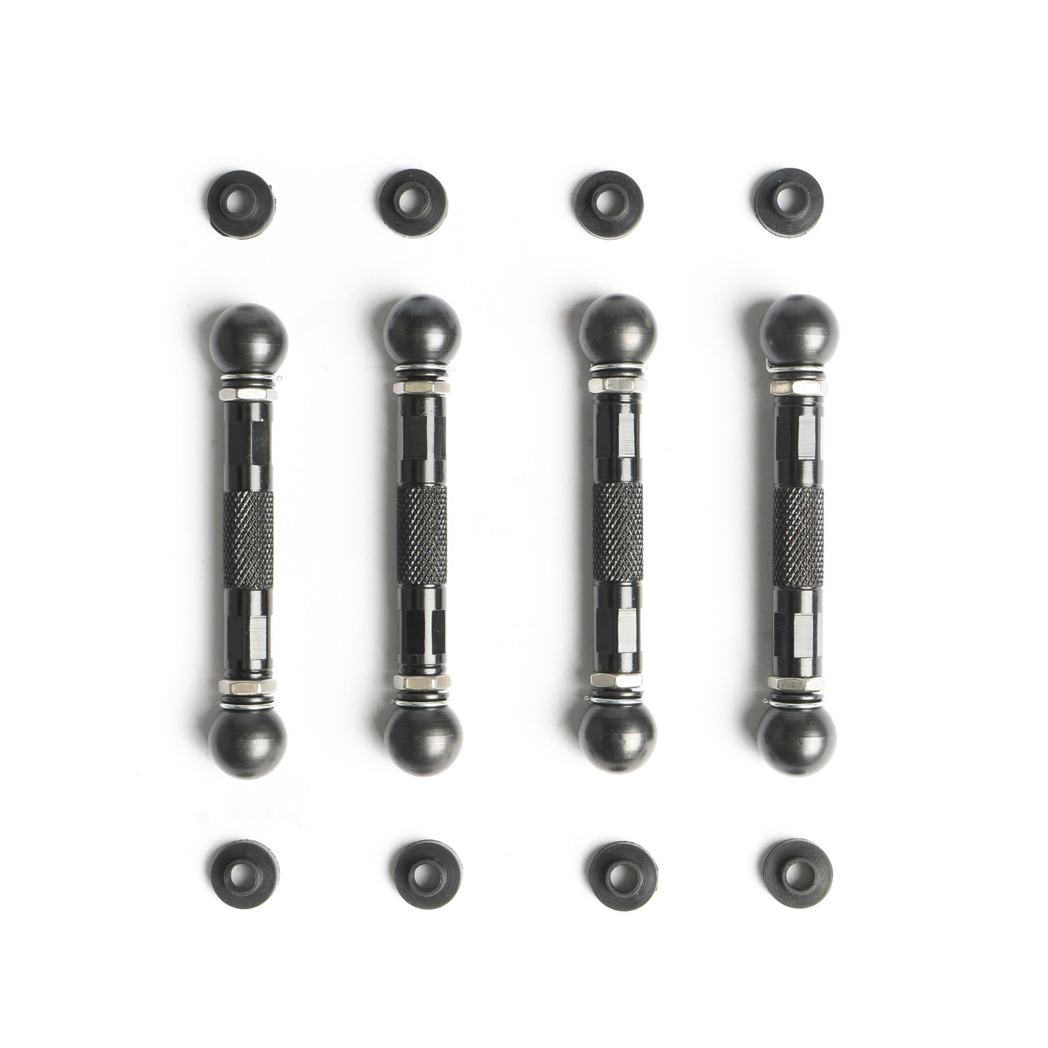 These are a direct OEM replacement with up to 50mm lowering adjustment. Our links are adjustable on the vehicle and do not have to be removed in order to adjust the ride height. Our links are also made from billet aluminum, making them ideal for reliability and hard driving.