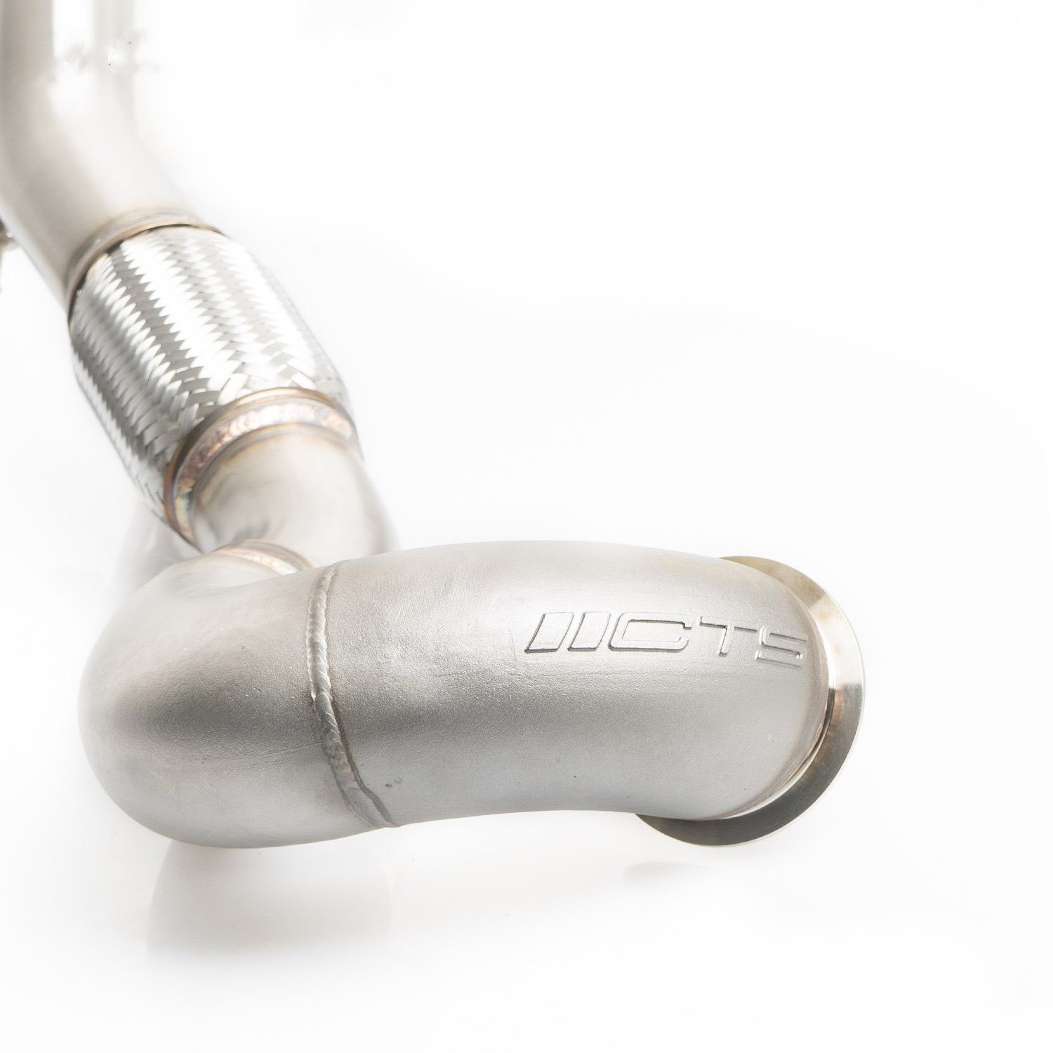 We are proud to release the new CTS Turbo 3.5″ Stainless Steel High-Flow Cat for the MK7 Golf R/8V Audi S3. Unfortunately, the factory downpipe that comes as standard equipment in your car was designed for anything but performance. The factory downpipe severely restricts exhaust flow and therefor has adverse effects on horsepower, especially once your car is “chipped”. The CTS Turbo High-Flow Cat will allow for your exhaust gases to flow smoothly, freeing up the additional ponies that you want, all while look amazing. Highlights of our High-Flow Cat include CNC machined turbine discharge (downpipe) flange, mandrel bent 3″ stainless steel tubing, modular design making installation of a catalytic converter simple and straight forward, smooth transitions allowing for optimal exhaust gas flow.
