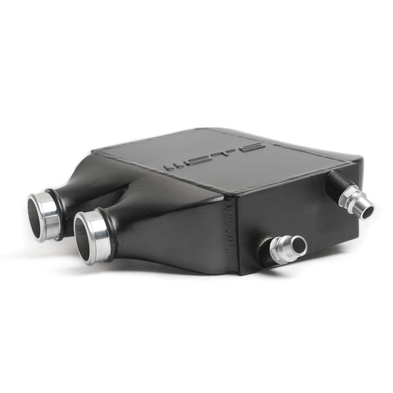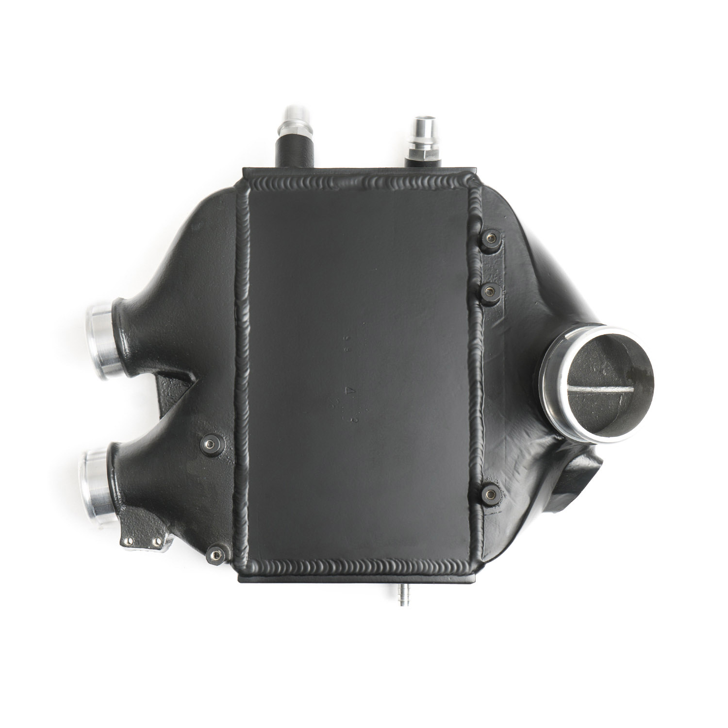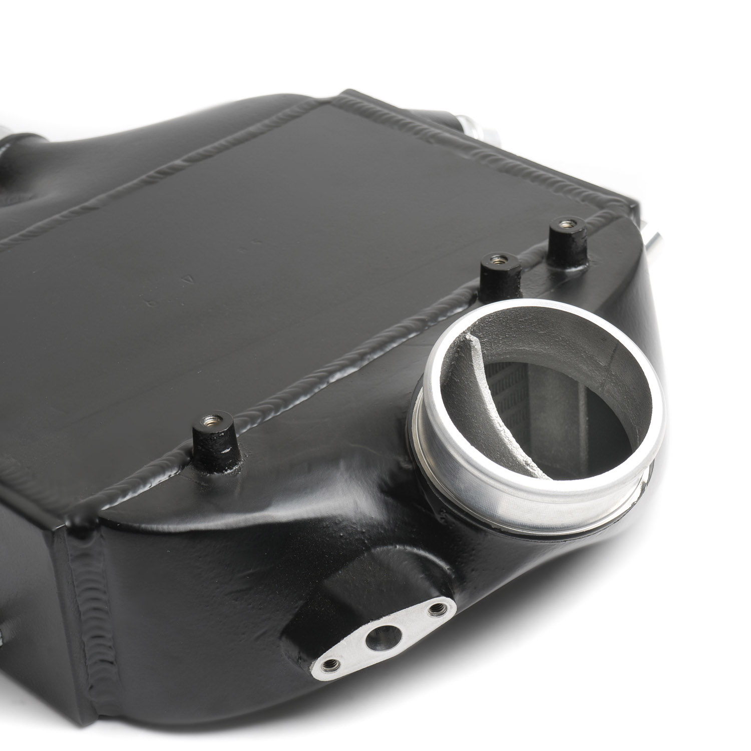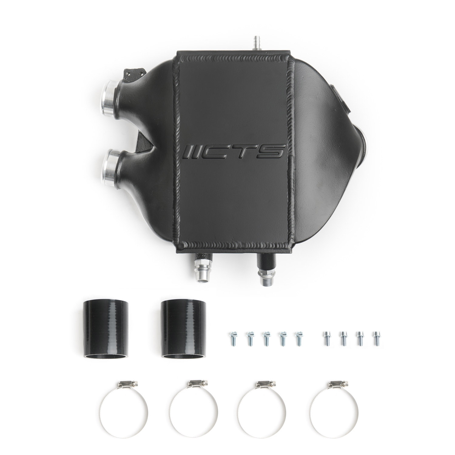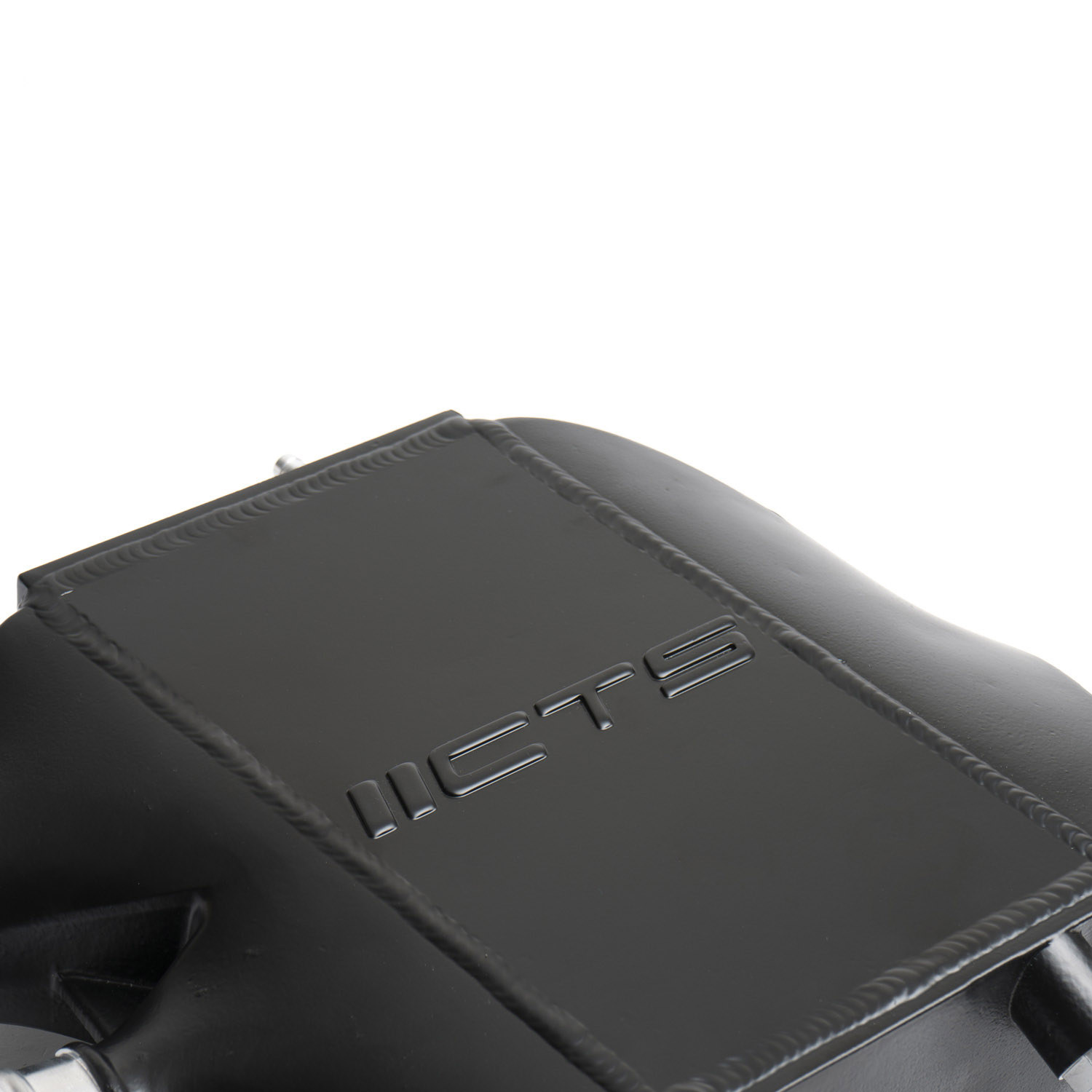 Our proprietary cast intercooler end tanks have flow-directing fins on the inlet and outlet to make sure the airflow stays streamlined for maximum efficiency. High-density bar-and-plate core is at the center of it all; covered with CTS logo top plate. CNC machined fittings, stainless steel helicoils in the mounting location, high-quality hardware and silicon couplers come standard. The assembly is hand-welded in house and pressure tested before we finish it in a semi-gloss black powder coat.