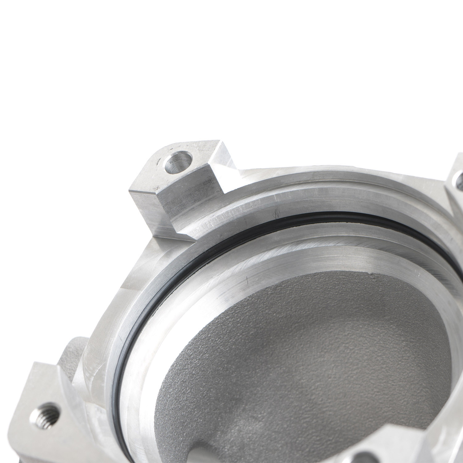 Our high flow throttle body inlet is designed it to be larger, but also more aerodynamic than the stock part. Our inlet has a 56% internal volume increase over the stock inlet. Using the latest CAD software, the shape of the inlet tract was flow optimized and cast from aluminum for best performance. All critical parts were CNC machined to ensure perfect fitment and performance.