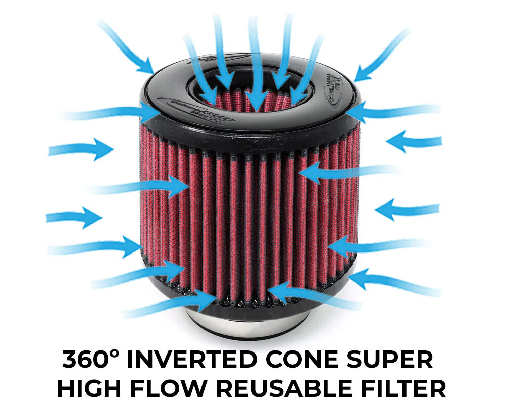 Our Burger Motorsports renewable inverted cone filters not only outflow your stock paper filter and last the life of your vehicle they also include built-in velocity stacks. Velocity stacks allow even more air to be smoothly sucked into your intake system.