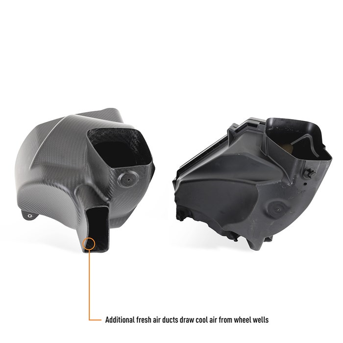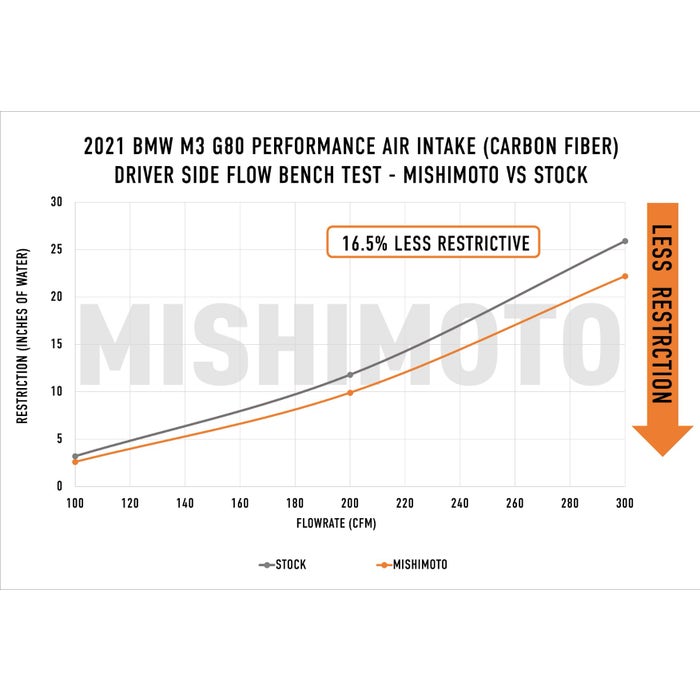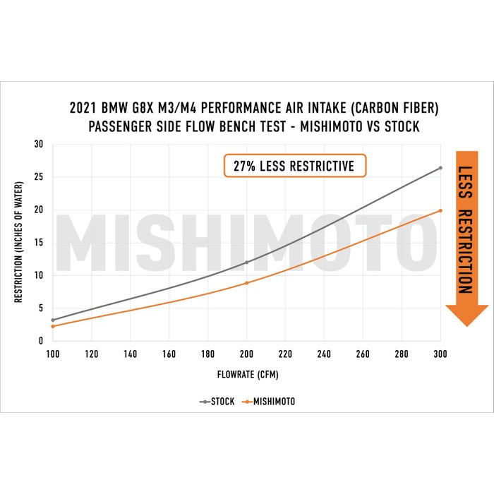 The M3 has undergone significant evolution over the years, with each new iteration bringing something new to the table. From the brilliant widebody E30 of the eighties to the exotic sounding V8-powered E9X, each generation has its own identity but holds true to the goals of providing an amazing driving experience. The G8X gets one of the most potent engines produced by BMW to date, the S58B30, along with an option for AWD. Enhancing the S58 was something we set our sights on soon after acquiring a G80 of our own, the first project being our air intake system. Airbox volume, shape, and construction material all play a part in delivering maximum airflow to your engine. Our engineering team created extremely precise carbon fiber airboxes that eliminate restrictions, supply maximum cool-air entry via two additional ports that open to the wheel wells, and improve engine bay aesthetics. The use of carbon fiber material ensures the air intake system will incur minimum engine bay heat soak and provides unmatched aesthetic appeal. Our airboxes were designed using the latest in 3D printing, CAD modeling, and flow bench technology. As a result, we reduced air intake restriction by 13% on the driver-side intake tract and 22.8% on the passenger-side intake tract. For proper filtration, this kit includes dual high-flow oiled air filters which provide improved filter surface area and improved airflow over the stock panel filters. In addition to the flow benefits, our intake system provides a significant amplification of turbocharger spool and bypass valve venting. These enhanced sounds provide a new level of enjoyment, adding to the incredible driving experience you expect from a BMW M-Series. The Mishimoto 2021+ BMW G8X M3/M4 Performance Intake is a complete bolt-on kit and includes all necessary components for an easy installation. As with all Mishimoto products, this carbon fiber performance intake kit includes our signature Mishimoto Lifetime Warranty.