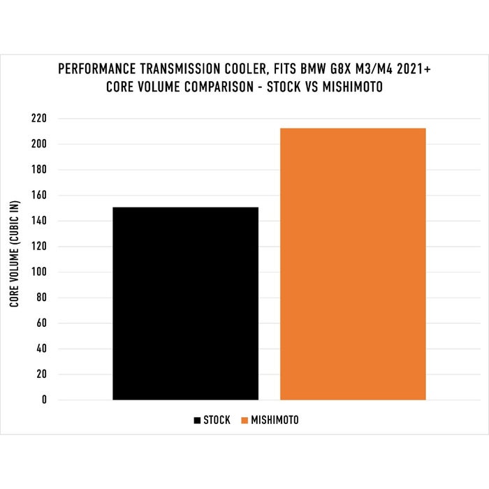 The Mishimoto 2021+ BMW G8X M2/M3/M4 Performance Transmission Cooler excels with its impressive 41-percent increase in core volume, delivering superior cooling efficiency compared to the stock cooler and keeping your transmission cool even in the most demanding driving conditions. This transmission cooler also offers a generous 17-percent increase in fluid capacity to increase the cooling potential of the entire system. Internal cooling fins increase the surface area in contact with the fluid to improve heat transfer and efficiency. The dual-pass design keeps fluid in the cooler longer, removing more heat without affecting airflow to other cooling components behind the transmission cooler.