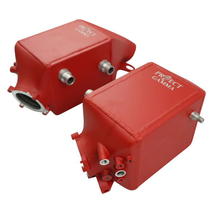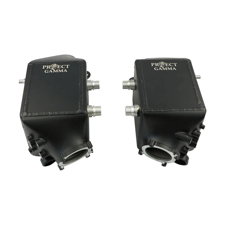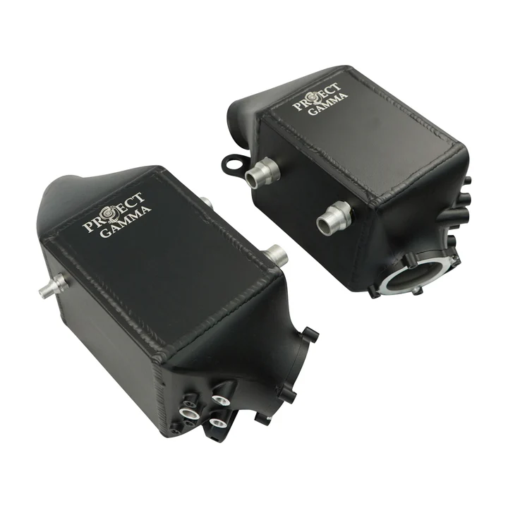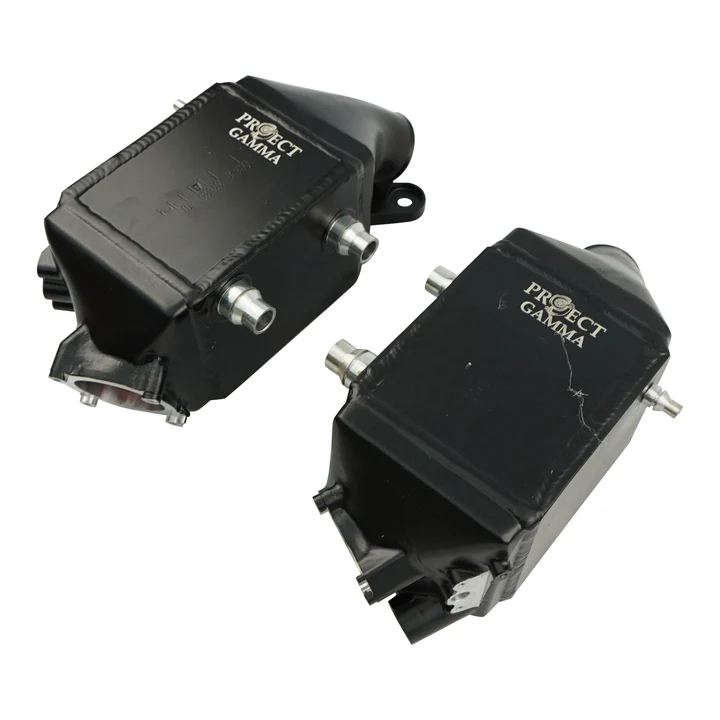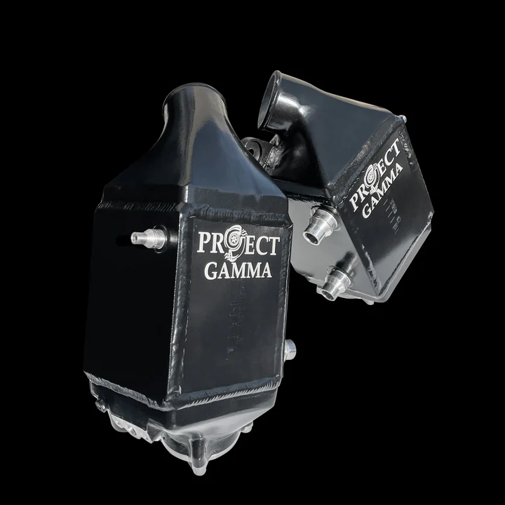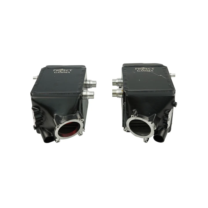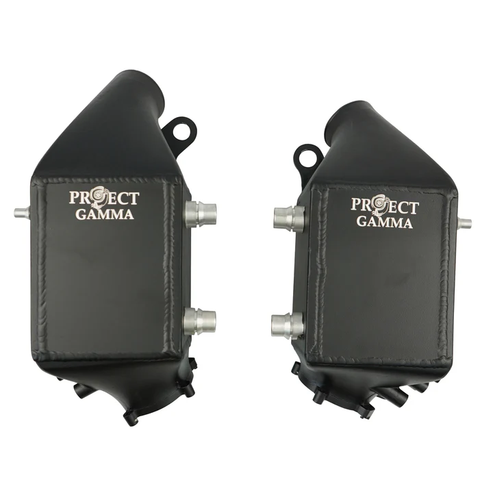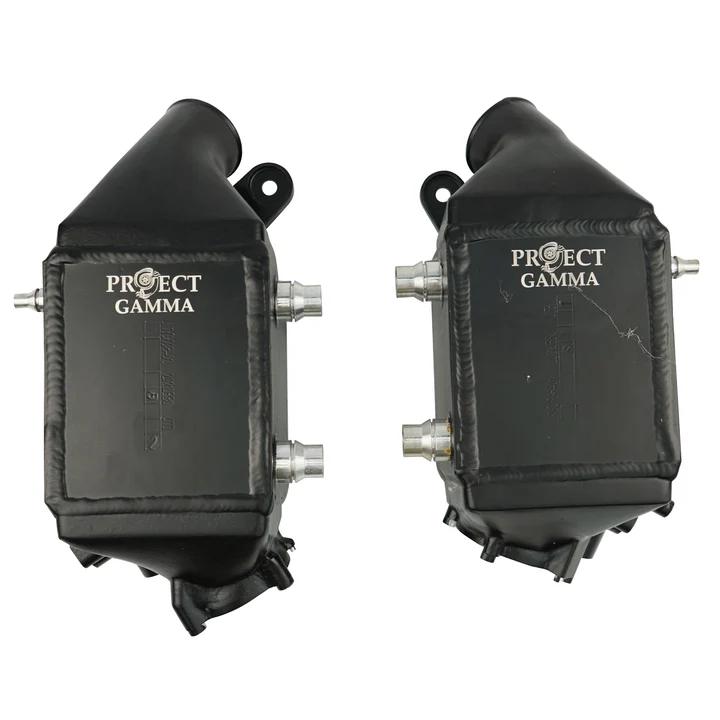 Project Gamma charge coolers for M5 and M6 models feature increased core size and capacity at 30% more than the OEM coolers. Our BMW M5 intercooler is designed for using 3D scanning to provide perfect and precise fitment. The water connections along with sensor ports are utilized the same way as OEM to allow for the same installation methods. Methanol injection is possible with the provided ports on the charge coolers.