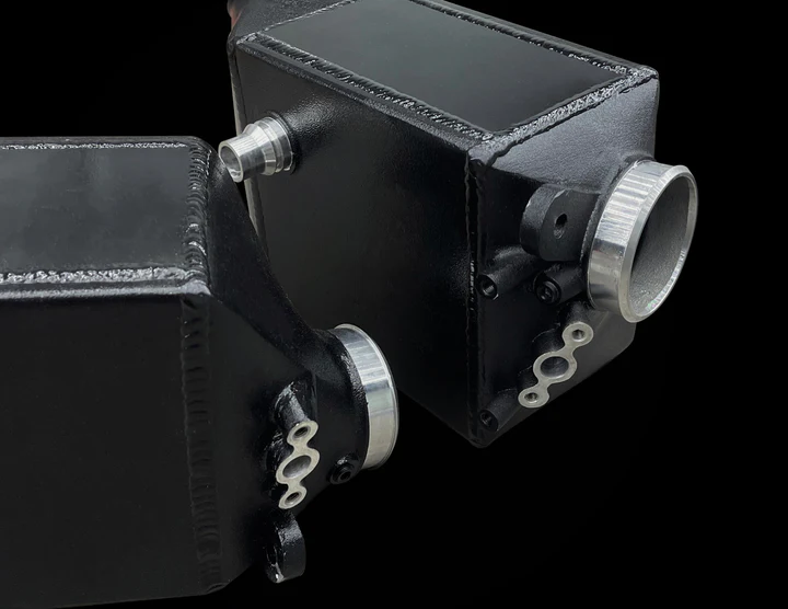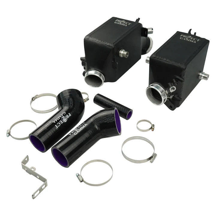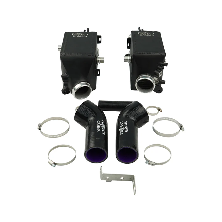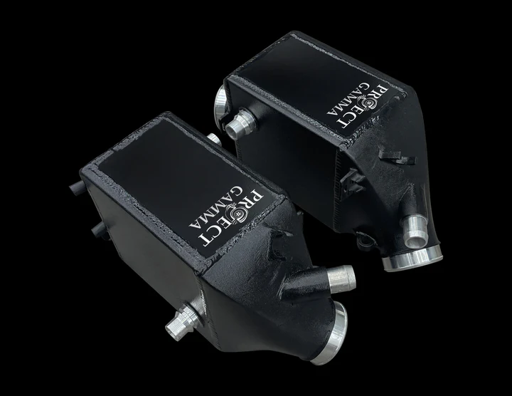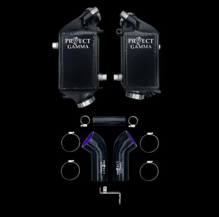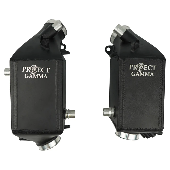 Project Gamma charge coolers for M5 and M8 models feature increased core size and capacity at 35% more than the OEM coolers. Our charge coolers are designed using 3D scanning technology to provide perfect and precise fitment. The water connections along with sensor ports are utilized the same way as OEM to allow for the same installation methods. Methanol injection is possible with the provided ports on the charge coolers.