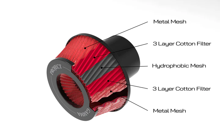 These filters now have a total of 6 layers of cotton filtration material with a hydrophobic mesh in the middle to protect from any water coming through. The colors of these new filters are slightly lighter to distinguish them from our previous version.