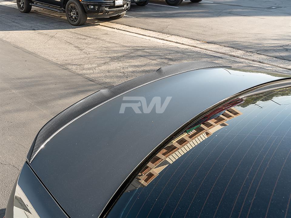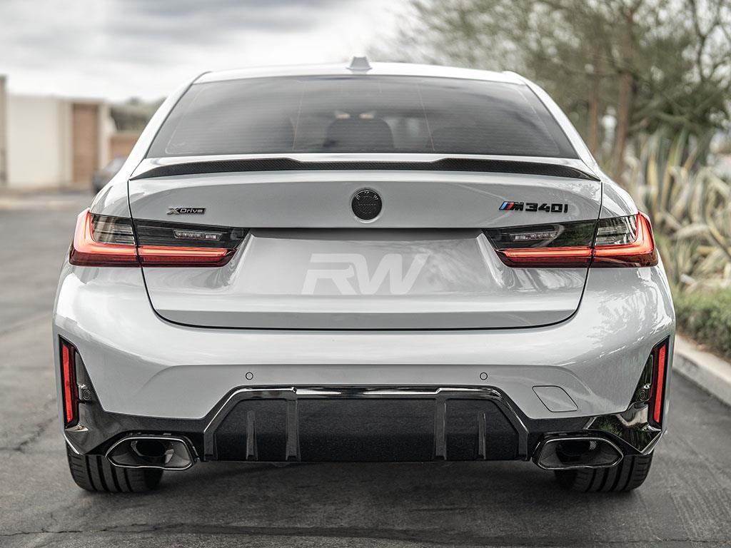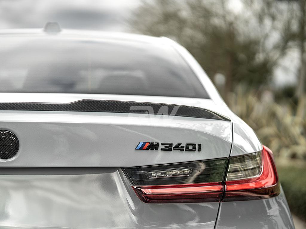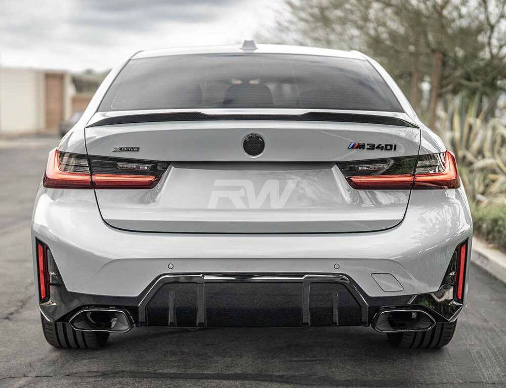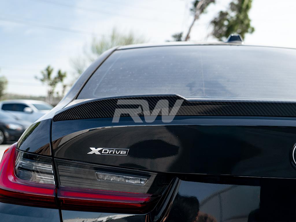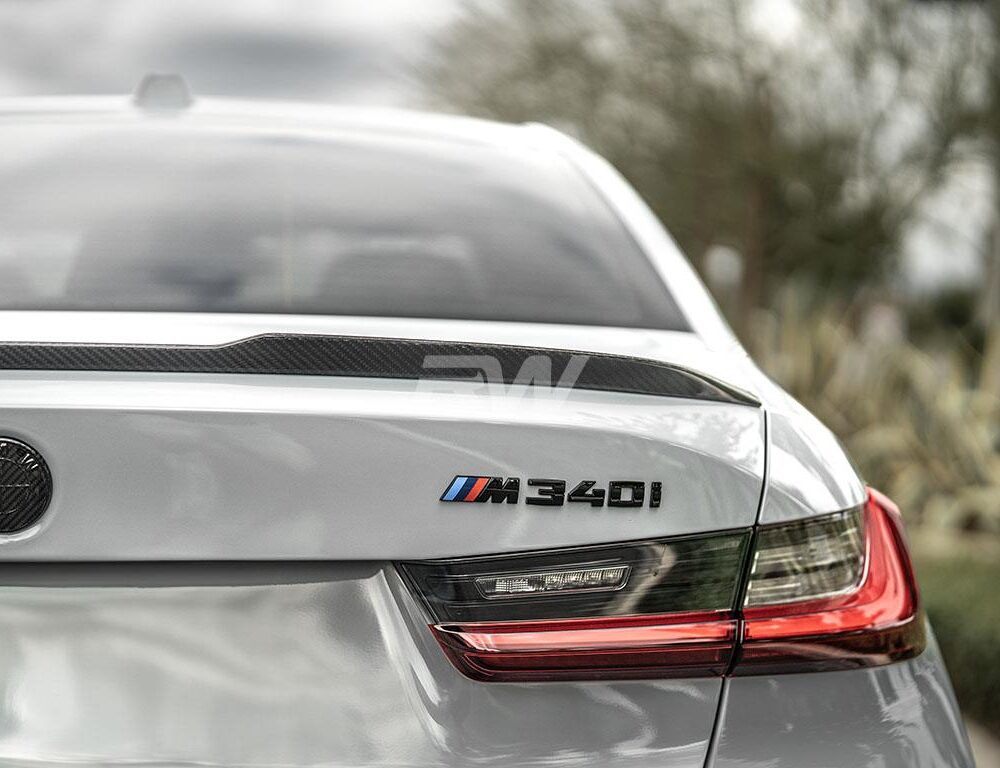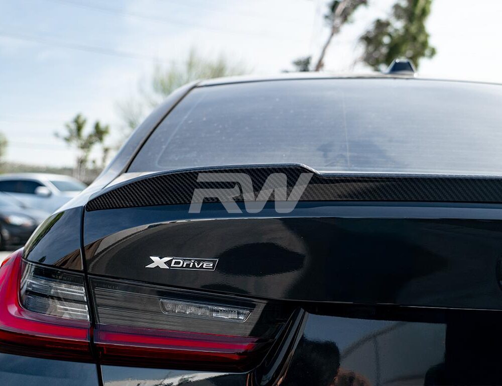 Add a stylish touch to your BMW G20 or G80 M3 trunk lid with this new M styled carbon fiber trunk spoiler. This spoiler fits all BMW G20 3 series models including the 330i and M340i, as well as the G80 M3. This trunk spoiler is made with RW Carbon’s 2×2 weave pattern so it matches all other G20 and G80 carbon fiber products from RW. Installation is a breeze and only requires 3M double sided tape (not included, but can be purchased at checkout). Installation is 100% reversible is you choose to remove it down the line. Each one is quality checked in our Southern California facility prior to shipping around the world. Get your very own M style G20 G80 trunk spoiler today and see the difference it will make for yourself