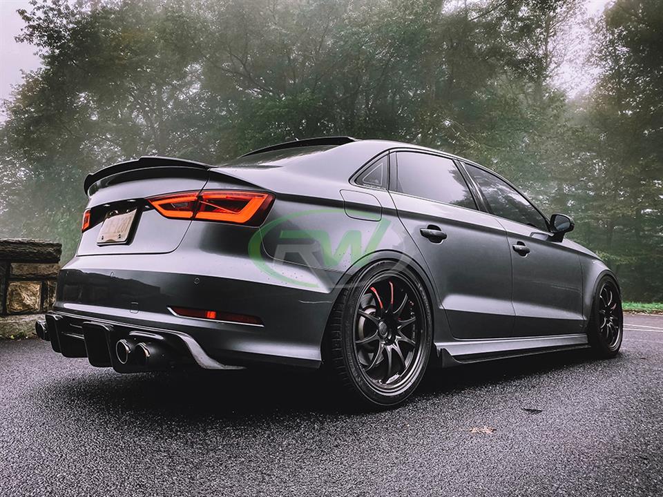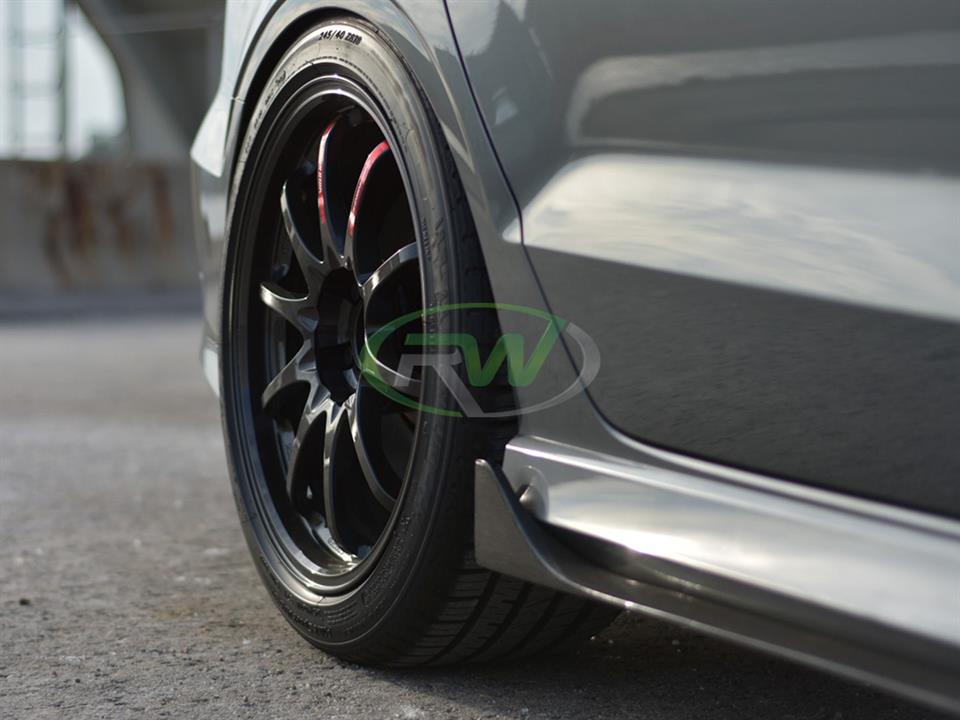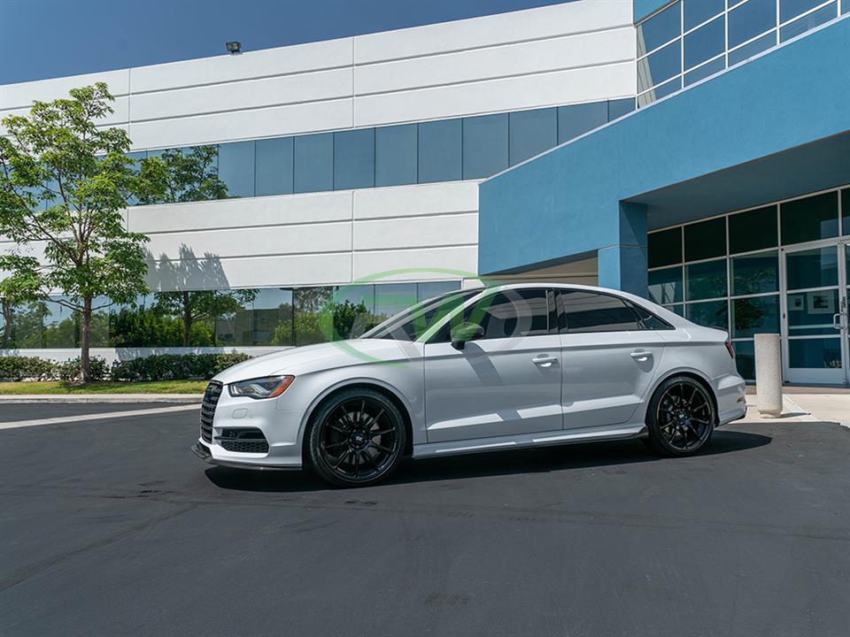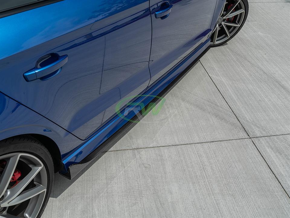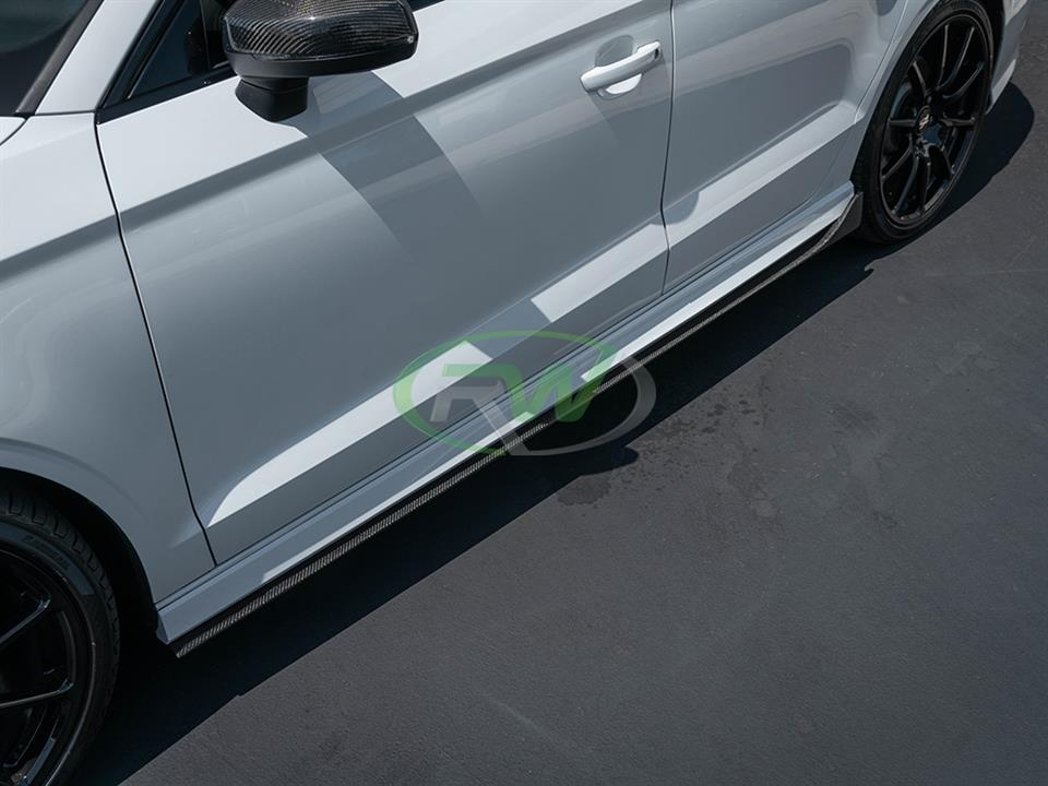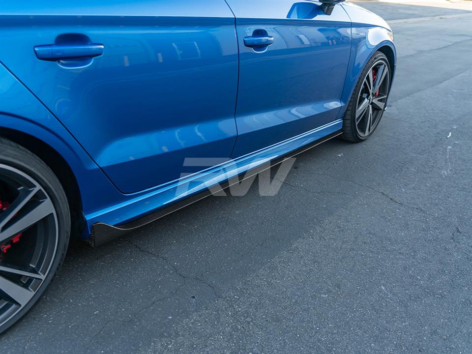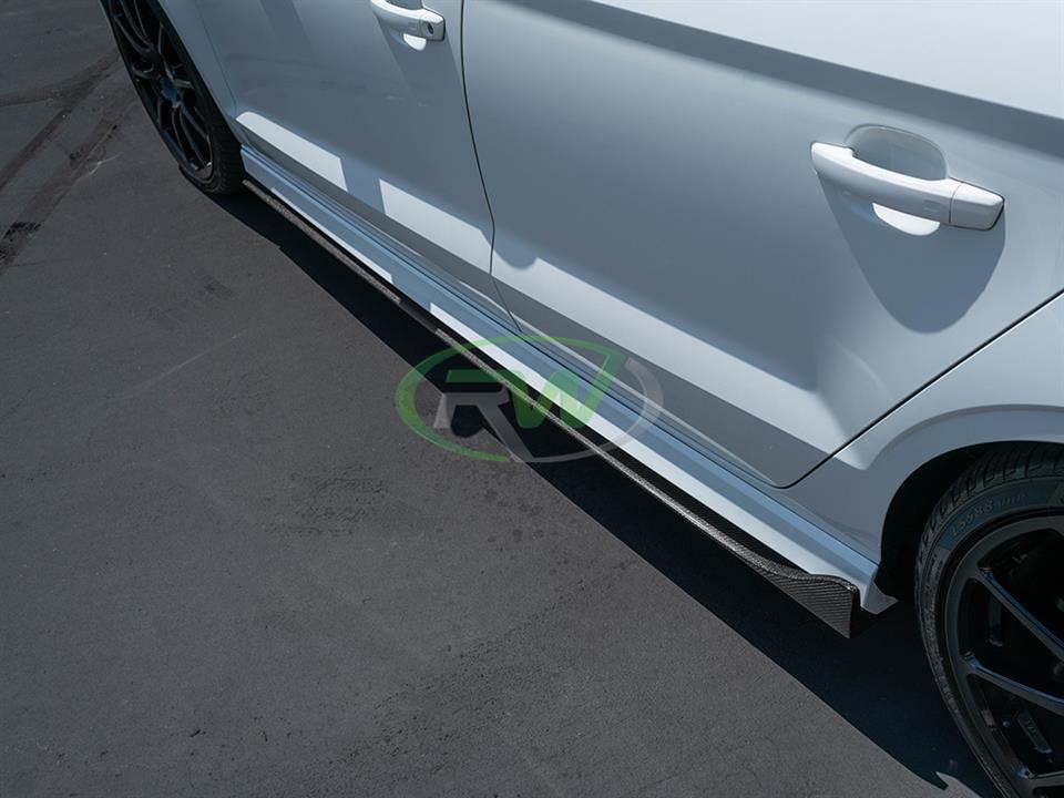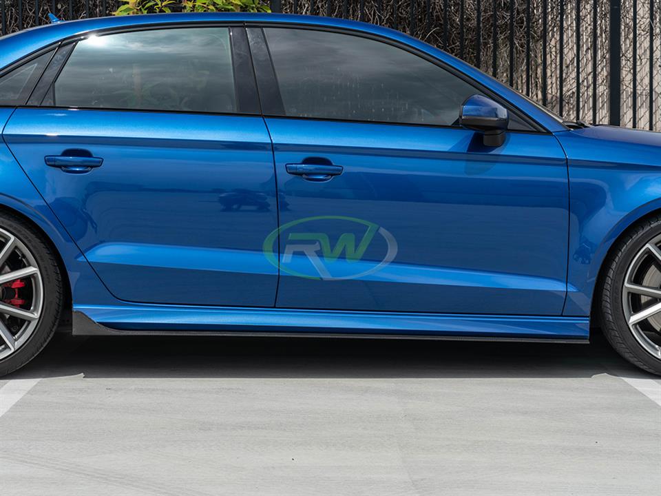 Enhance the side profile of your Audi 8v A3, S3 or RS3 with our RW Carbon Fiber Side Skirt Extensions. These Carbon Fiber Side Skirt Extensions change up the look of the side profile and gives your car a more aggressive stance out on the road. Our Side Skirt Extensions are backed by our fitment and quality guarantee to ensure that this product is going to fit well and hold its quality. Along with the fitment, this product is coated with our high quality clear coat to ensure that this product will not fade or discolor over time. If you have any questions about our Audi 8v CF side skirt extensions, please contact us.