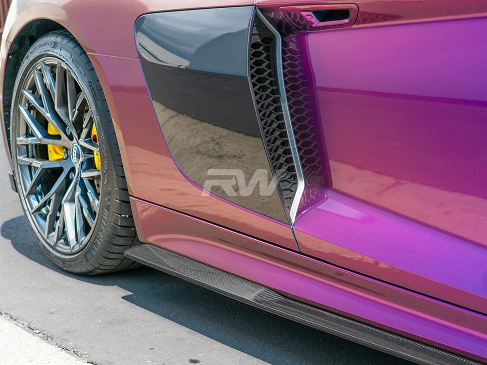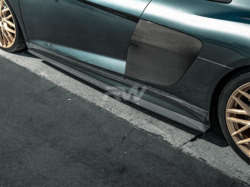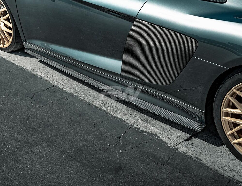 With the Audi R8 being such a notorious and good-looking car, we knew it was a great opportunity to come out with some additional exterior carbon fiber for this vehicle. Our Audi R8 Carbon Fiber Side Skirt Extensions are the perfect finishing piece to tie your front lip and rear diffuser together. Since the rocker panels are the same for all 4S R8s these carbon fiber side skirt extensions will fit both pre facelift and facelift applications . These side skirt extensions are constructed using the same 2×2 carbon fiber weave that you see present from the factory on your Audi R8. Along with the appealing image, these side skirts also come with a fitment and quality guarantee to ensure you are not only getting pieces that look good, but also fit great.