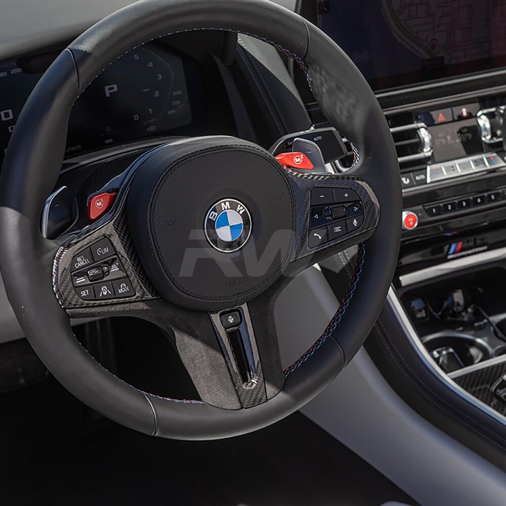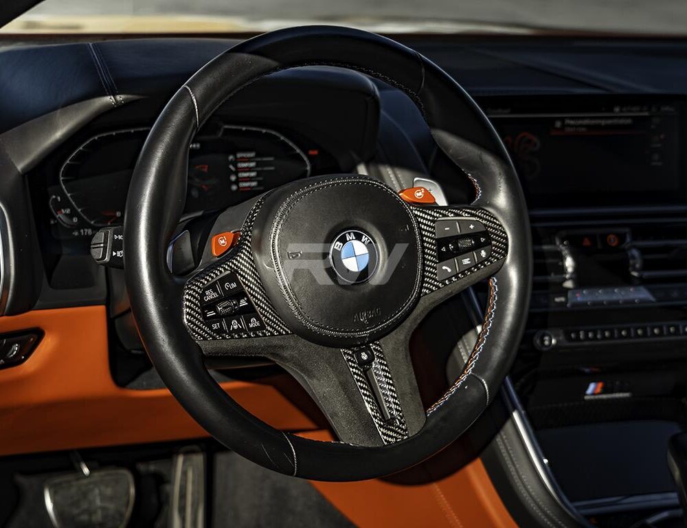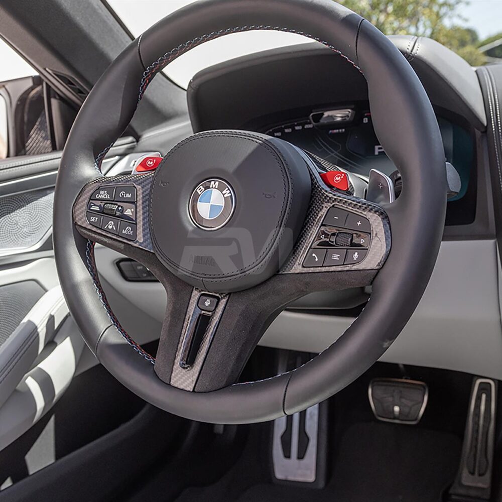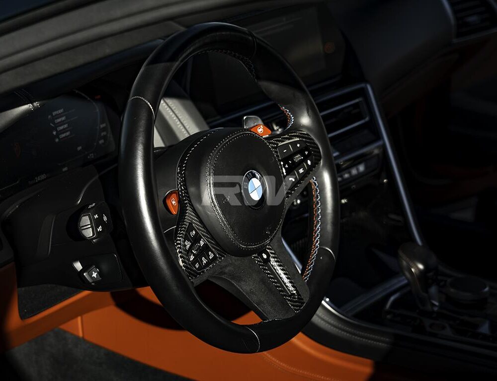 This carbon fiber steering wheel trim piece fits the BMW G14 F15 G16 8-Series and the F91 F92 F93 M8. This piece is made using real carbon fiber and alcantara and re-uses the OEM mounting locations for an easy installation process. Complete your CF interior look with a brand new center CF steering wheel trim from RW Carbon today! If you have any questions, please do not hesitate to ask.