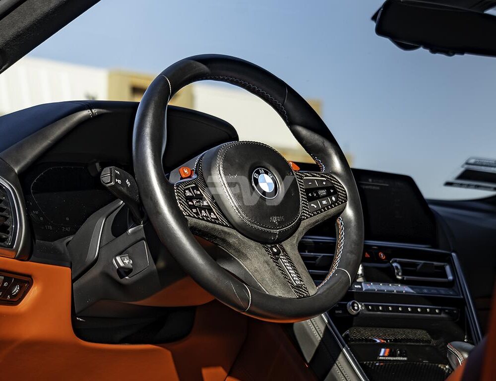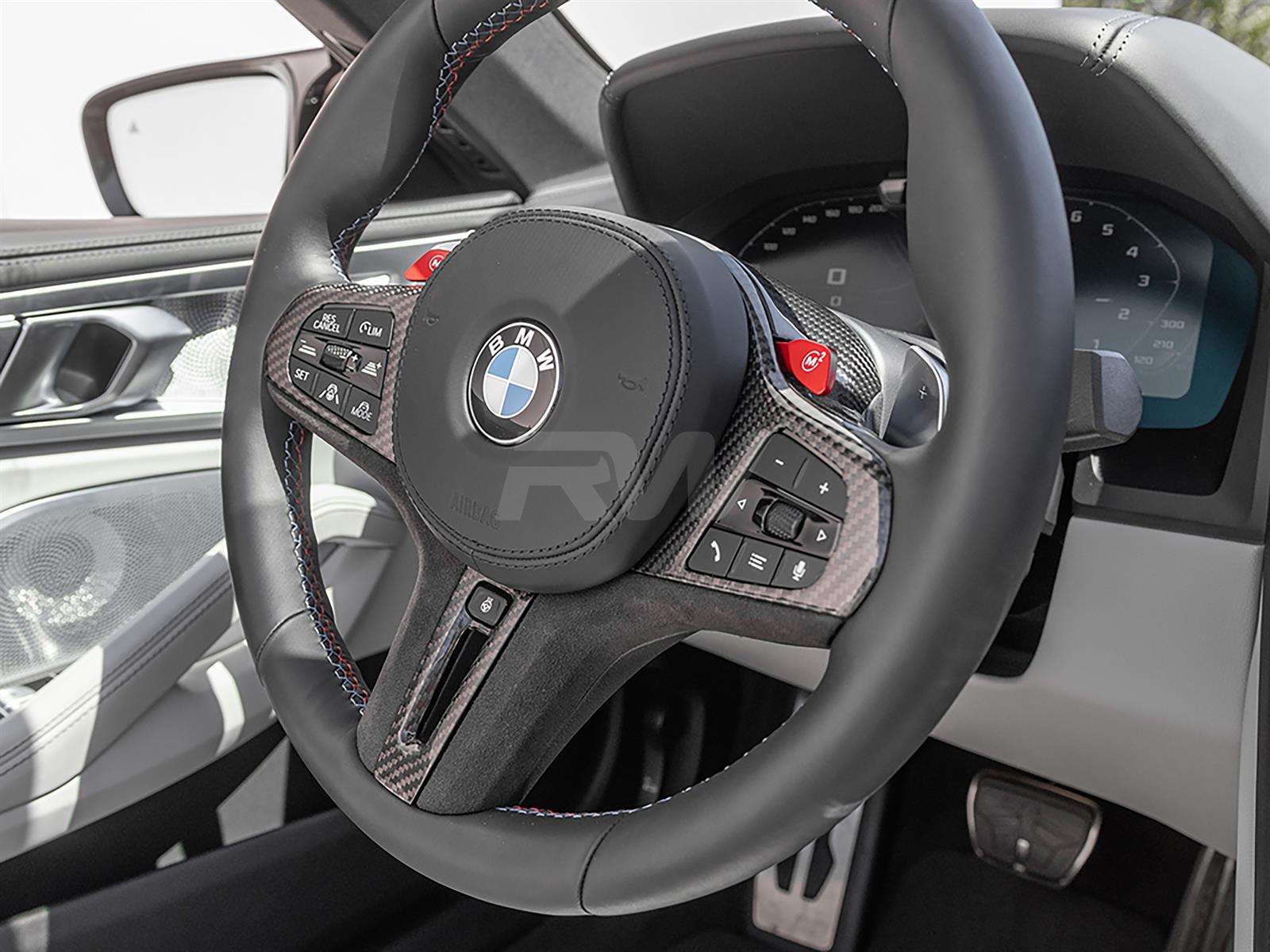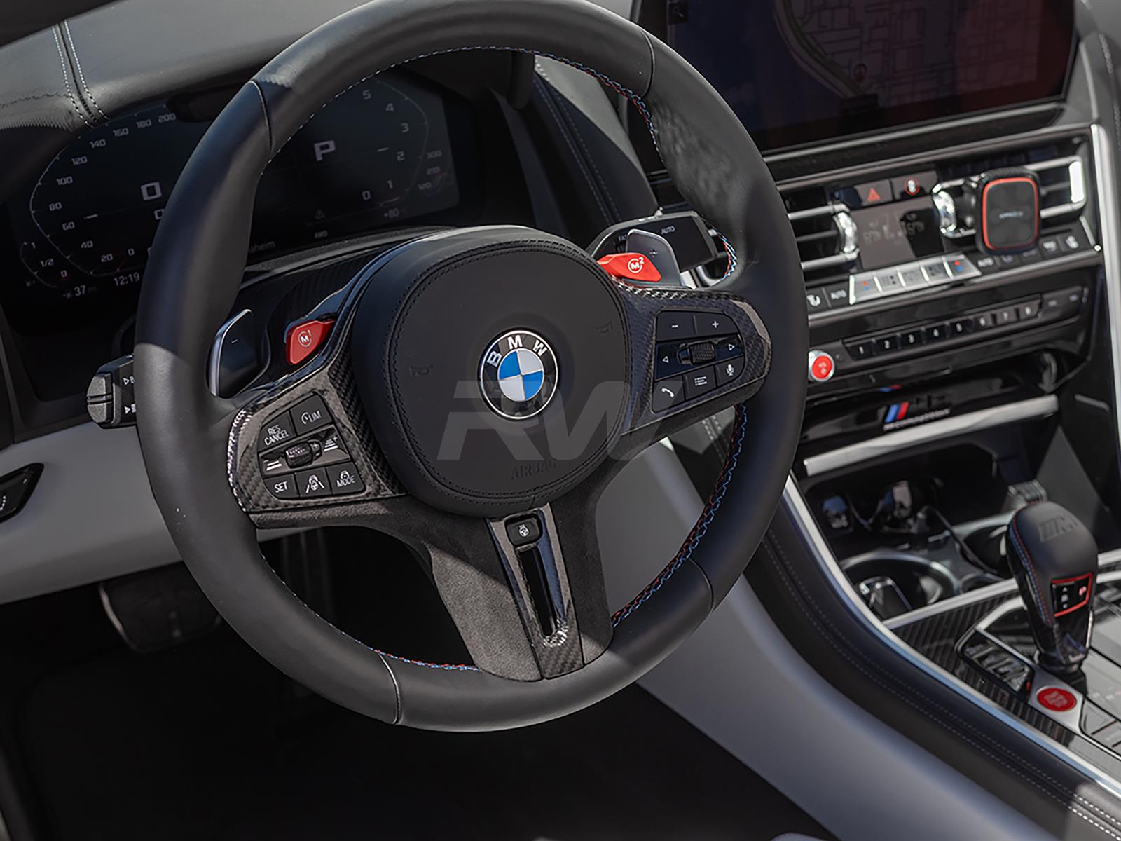 This carbon fiber steering wheel trim piece fits the BMW G14 F15 G16 8-Series and the F91 F92 F93 M8. This piece is made using real carbon fiber and alcantara and re-uses the OEM mounting locations for an easy installation process. Complete your CF interior look with a brand new center CF steering wheel trim from RW Carbon today! If you have any questions, please do not hesitate to ask.