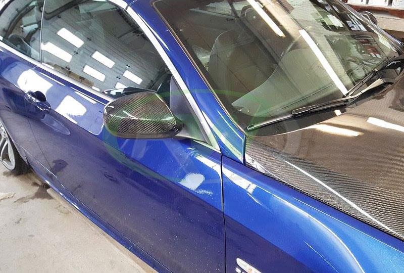 Complete the exterior look on your 2010+ E92 or E93 LCI with these carbon fiber mirror covers. We have been working on this item for quite a while for our E92/E93 LCI customers – Our mirrors feature full carbon construction! This means the mirrors have an excellent carbon fiber quality and finish, and will last many years to come. Note how our mirrors are carbon fiber on the back, not black like all competitor options. These E92/E93 LCI carbon fiber mirror covers fit 2010-2013 328i, 335i, or 335is (Coupe or Convertible). These E92/E93 LCI carbon fiber mirror replacements are not the stick on mirror covers – These are a much higher quality solution which fully replaces the existing painted mirror cap that is on the vehicle.