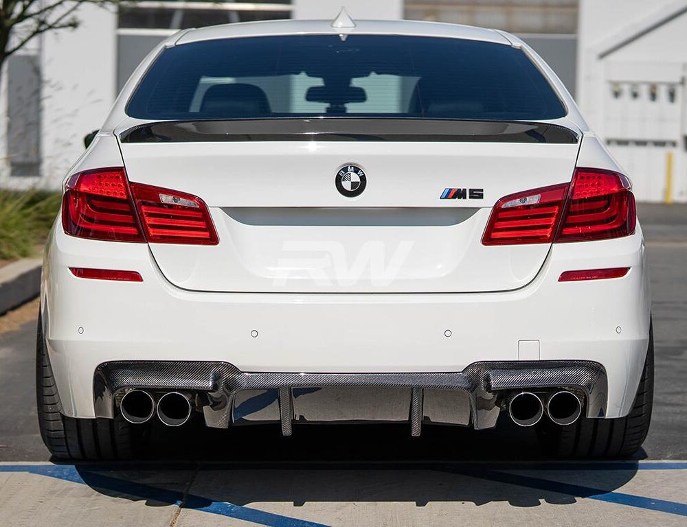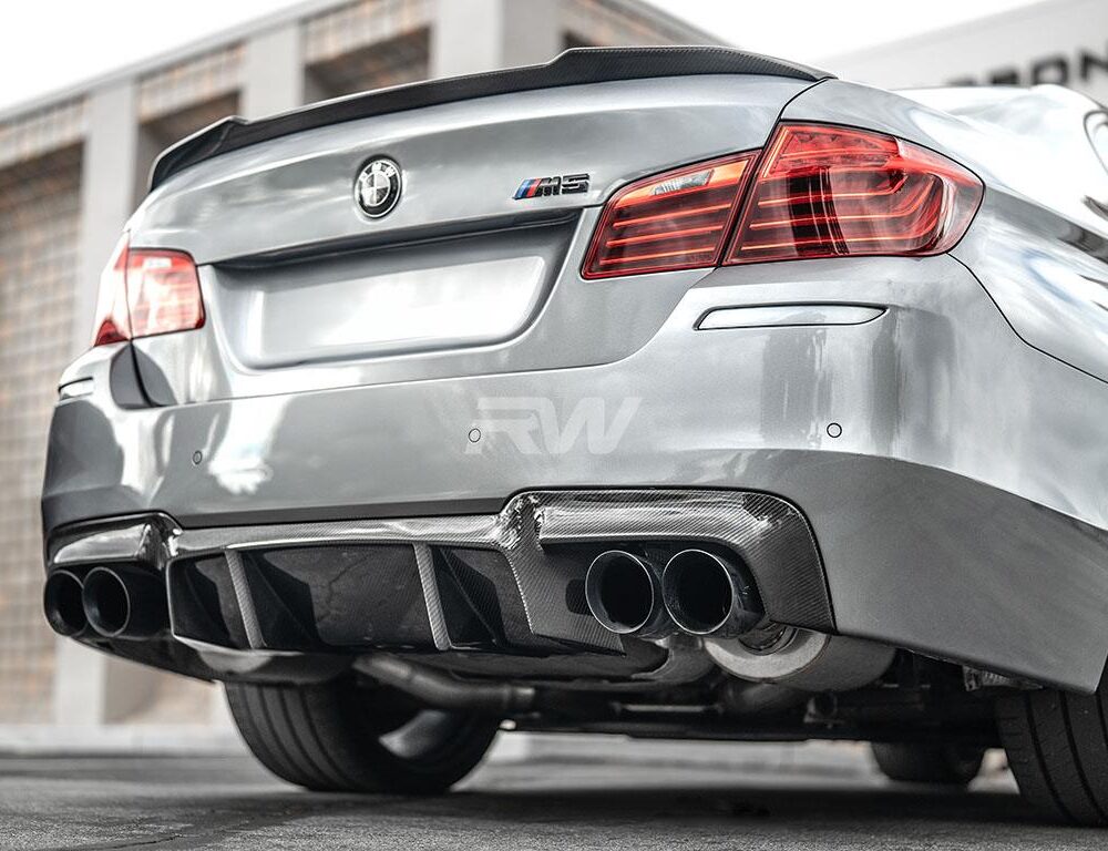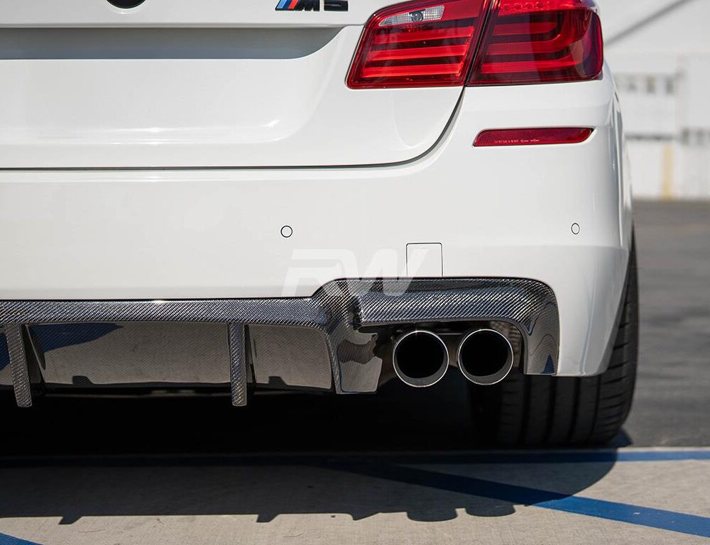 The BMW F10 M5 is a iconic M car that definitely looks the part with its aggressively styled body kit and quad exhaust tips. However, there is something about the rear diffuser that leaves something to be desired. RW Carbon makes this DTM carbon fiber rear diffuser for the M5 that replaces your OEM diffuser, adding a unique, race inspired touch. This diffuser is hand crafted using genuine carbon fiber and incorporates 2 large fins. We make these using 2×2 CF weave which will match all of our other F10 M5 carbon fiber parts. They will fit all F10 M5 models including 2012-2017. Each piece is clear coated for a brilliant shine and quality checked prior to shipping to your door anywhere in the world.