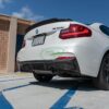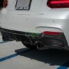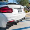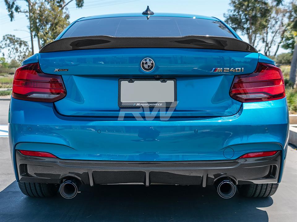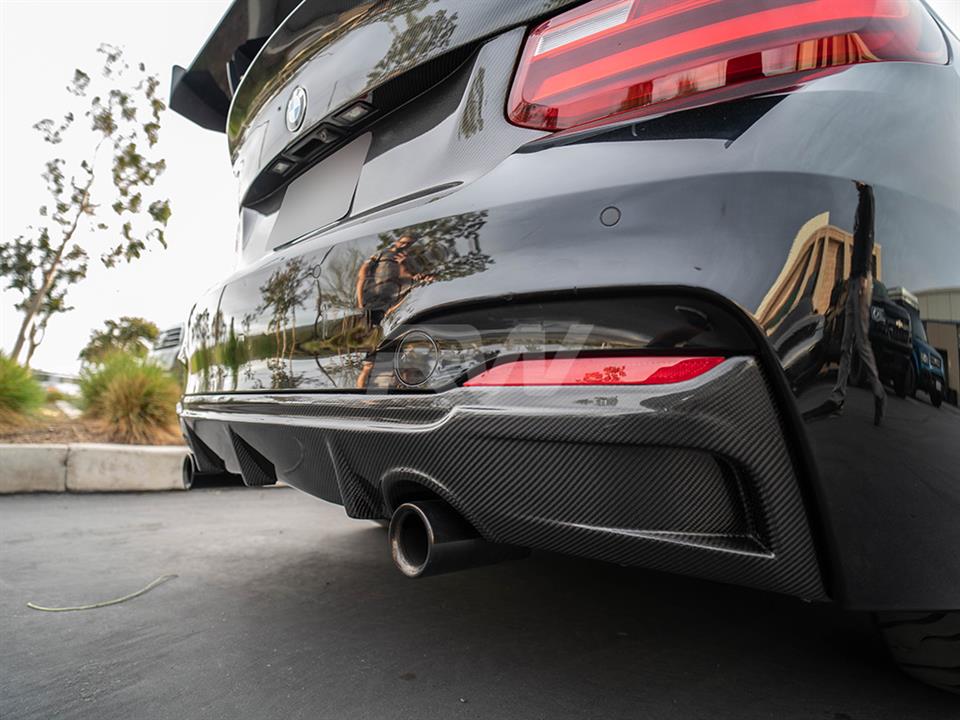 A carbon fiber rear diffuser is a must if you are going with other carbon fiber parts. It really brings the theme together and adds that race inspired feel to the rear end of your BMW F22 or F23 2 series. This diffuser features 2×2 carbon fiber weave that will match CF mirror caps or spoiler you already have installed on your car. We complete the diffuser with a high quality clear coat to reduce the chance of fading or discoloration after a few years of use. The carbon fiber diffuser will fit the 2014-2021 M235i and M240i right out of the box, if you have the 228i or 230i you will need a dual exit aftermarket exhaust. Please contact us if you have any questions.