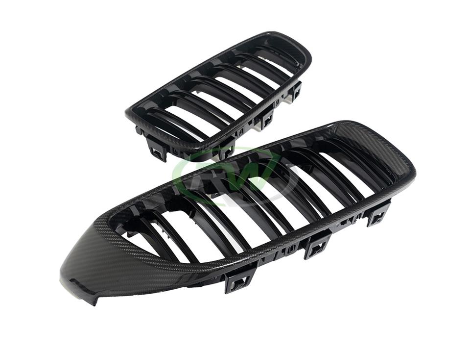 RW Carbon brings you another sweet carbon fiber offering for your F32, F33, F36, F80, F82, or F83. These carbon fiber grilles feature the desirable double slat design with the outer portion of the kidney grille being finished in genuine carbon fiber. Recently we have upgrade the way in which these carbon fiber grilles are crafted. The carbon fiber grilles feature a pre-preg outer carbon fiber ring that is installed on a base plastic grille. Manufacturing the grilles like this we were able to vastly improve the life of the grilles, as well as provide an improved visual appearance as the pre-preg carbon fiber have more of a carbon fiber “pop” to them. Our carbon fiber grilles feature 2×2 CF weave that will nicely match any other RW or OEM CF parts you have installed on the vehicle. Only use the best carbon fiber items on your BMW 4 series or M3/M4 and opt for the RW Carbon CF replacement grilles. NOTE: This item is sold in pairs.