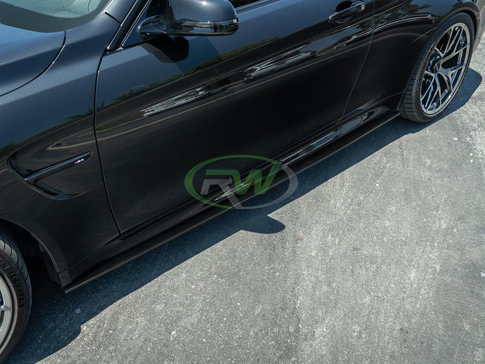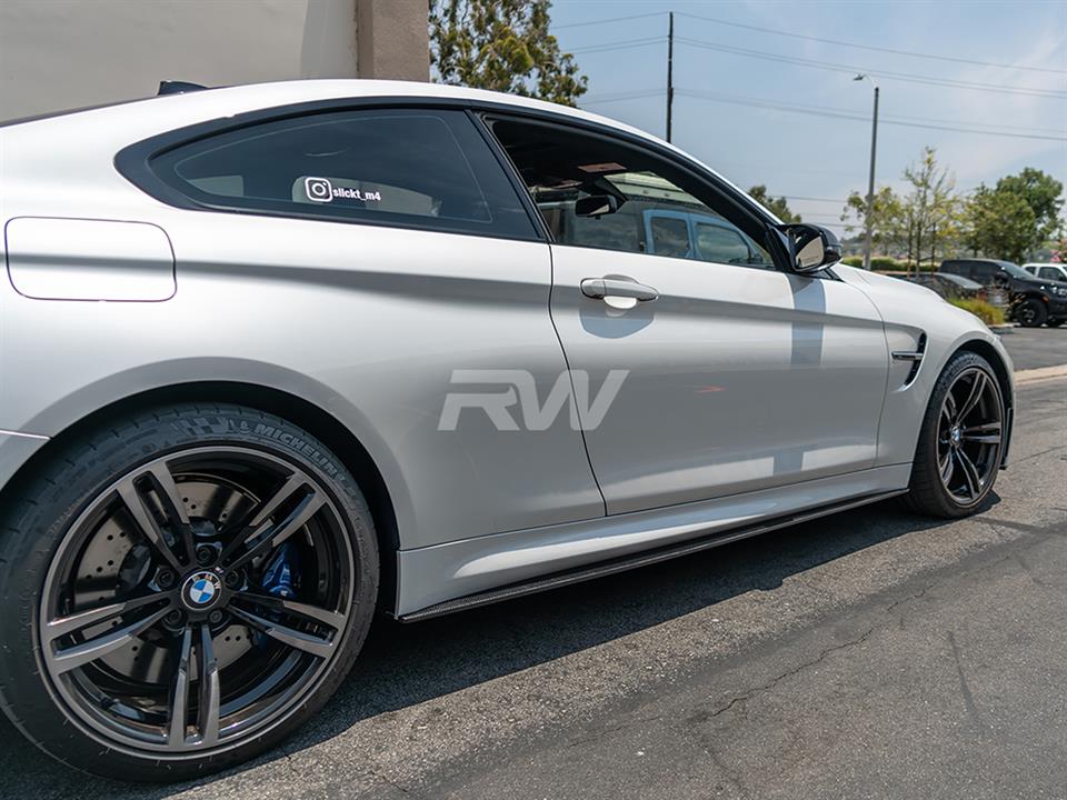 Seamlessly pair your RW front lip and rear diffuser on your F82/F83 M4 with these Carbon Fiber Side Skirt Extensions. These carbon side skirt extensions easily mount to your existing side skirts using our self-tapping screws, and offer a subtle exterior appearance upgrade. Crafted in a 2×2 weave and finished with a UV-resistant clear coat, these side skirts are made to match all other RW Carbon parts installed on your M4. Give your M4 a unique upgrade and dominate the streets today! If you have any questions about these BMW M4 side skirt extensions, please contact us.