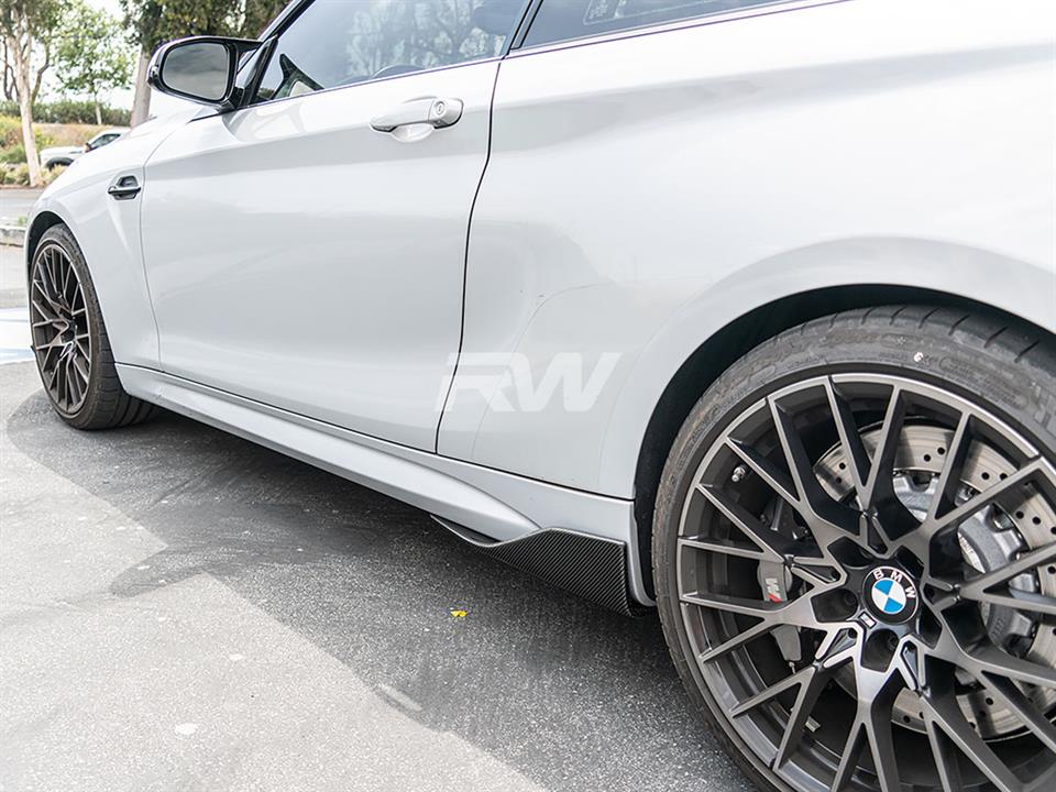 In order to complete your carbon fiber aero kit for your BMW F87 M2, these 100% dry carbon fiber side skirt winglets are a must have. They simply install to the rear section of your side skirt and add that must needed touch that brings your CF theme together. Installation is a breeze using self-tapping screws, which are included with purchase. These carbon fiber winglets are of course constructed out of genuine carbon fiber and are finished off with a clear coat for a glossy shimmer. Each and every piece that leaves RW Carbon, including these side winglets are quality checked in house before they are shipped worldwide. If you have any questions about these F87 M2 skirt winglets please reach out to one our CF Experts.