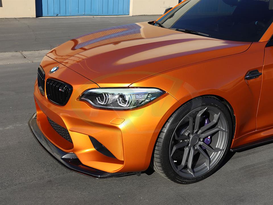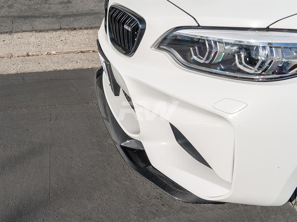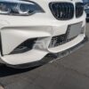 BMW GTS inspired appearance is now available from RW Carbon with our F87 M2 GTS Style Carbon Fiber Front Lip. This front lip is available in two options: upper only which just includes the upper-most portion which is attached to the vehicle, and full 2pc which also includes the lower adjustable spoiler. The lower splitter can be adjust to achieve more down force. Each F87 GTS Style carbon fiber front lip is crafted from real 2×2 carbon fiber that will perfectly match any OEM CF or RW CF parts you currently have installed on the M2. Just like all of M2 items this GTS style lip features bolt on installation that doesn’t require any special modifications to your car. Opt for the 2pc kit and you will receive a lower spoiler which can be adjusted depending on your mood or driving routes for the week. Additionally each front lip will come finished with a UV resistant clearcoat making the finish more resilient when compared to other items on the market.