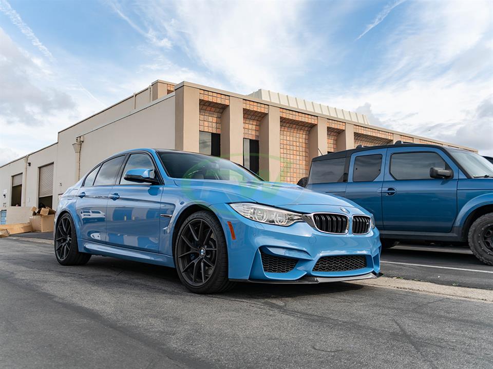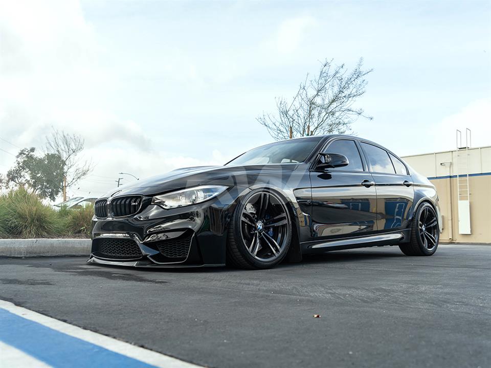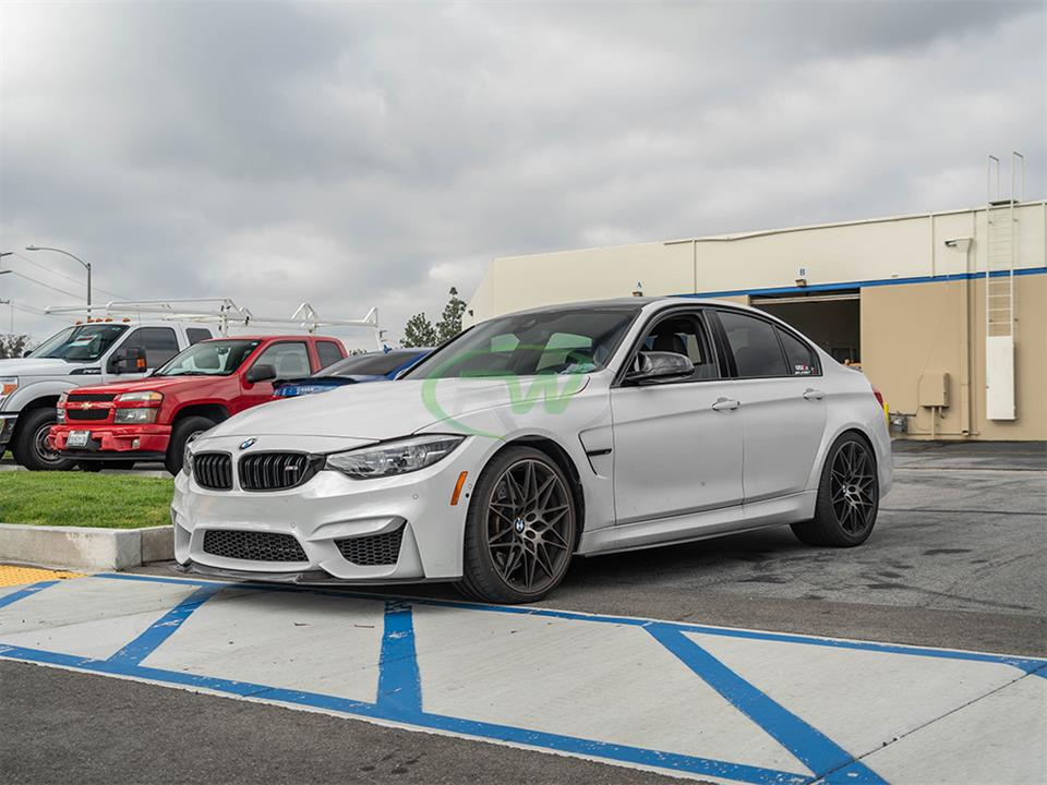 This CS style front lip for your F8x M3 or M4 can be either installed using self tapping screws or can be bolted to the chassis using GTS brackets. These brackets are not included but the screws will be. If you rather install the front lip with brackets please contact us. Using screws will not sacrifice the integrity of the install but it will require drilling small holes into the bottom of your bumper. Professional installation is recommended, or bring it to us and we can install it for you.