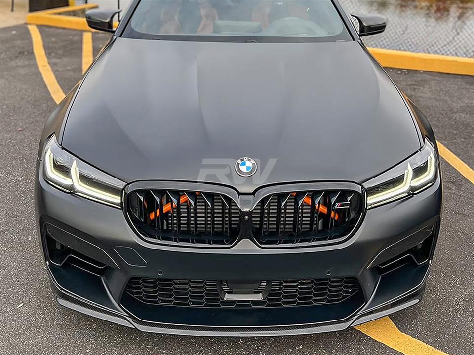 RW Carbon presents a new style of front lip for the 2021-2023 F90 M5 Competition LCI with this CS style carbon fiber front lip. This F90 M5 carbon fiber lip is crafted from 100% dry carbon fiber that will nicely match any OEM or RW parts you have installed on the vehicle. The full carbon is made to be more resilient and lighter than its more traditional counterpart. Installation is completed with a combination of OEM hardware and self-tapping screws. To ensure the front lip maintains a high shine we complete each with a UV-resistant clearcoat. This layer will not only give your new front lip a high gloss finish, but also will protect it from the elements and make it easy to clean and maintain. As always, each CS style F90 M5 lip comes backed by the RW fitment and quality guarantee.