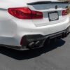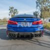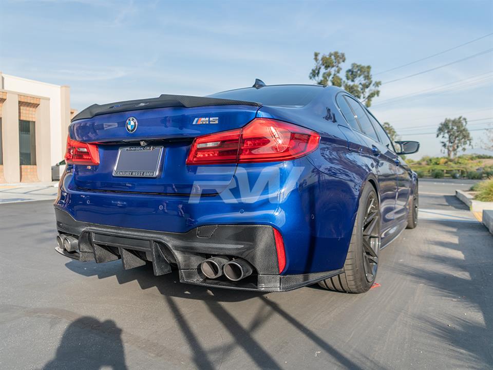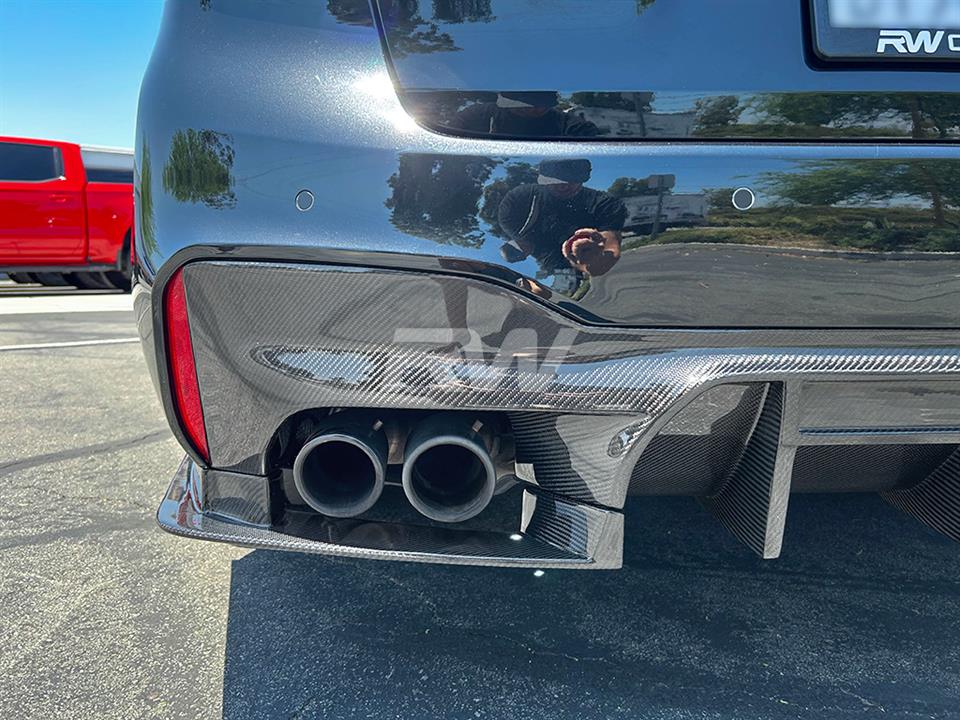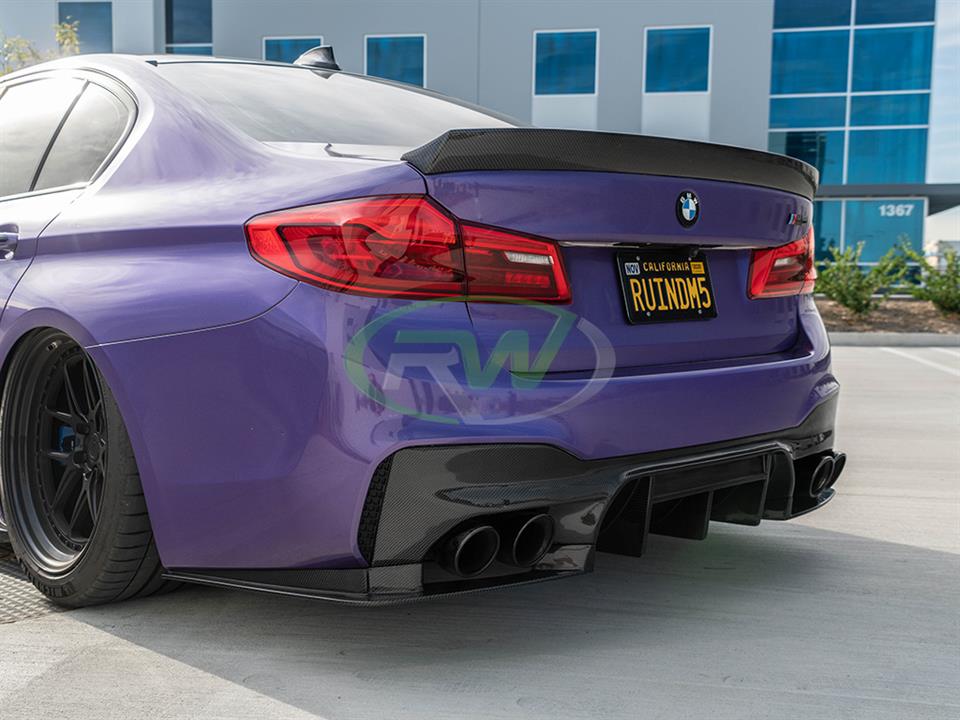 RW Carbon is proud to present our RWS or RW Signatures carbon fiber rear diffuser for the 2018-2023 BMW F90 M5. All RWS parts on this website are designed in house at RW Carbon at their Southern California facility. This diffuser is 100% unique and right now is the most aggressive diffuser option we make for the BMW F90 M5. It is made using 100% carbon fiber, making it lightweight and very durable. The design is made in 3 pieces; the main diffuser and two side pieces that wrap around the bumper. Every RWS diffuser is hand built and completed with a clear coat and polish for a high gloss finish. Each and every diffuser is quality checked and a custom package prior to shipping around the globe. If you have any questions about our F90 M5 RWS diffuser, please give us a call.