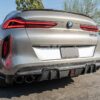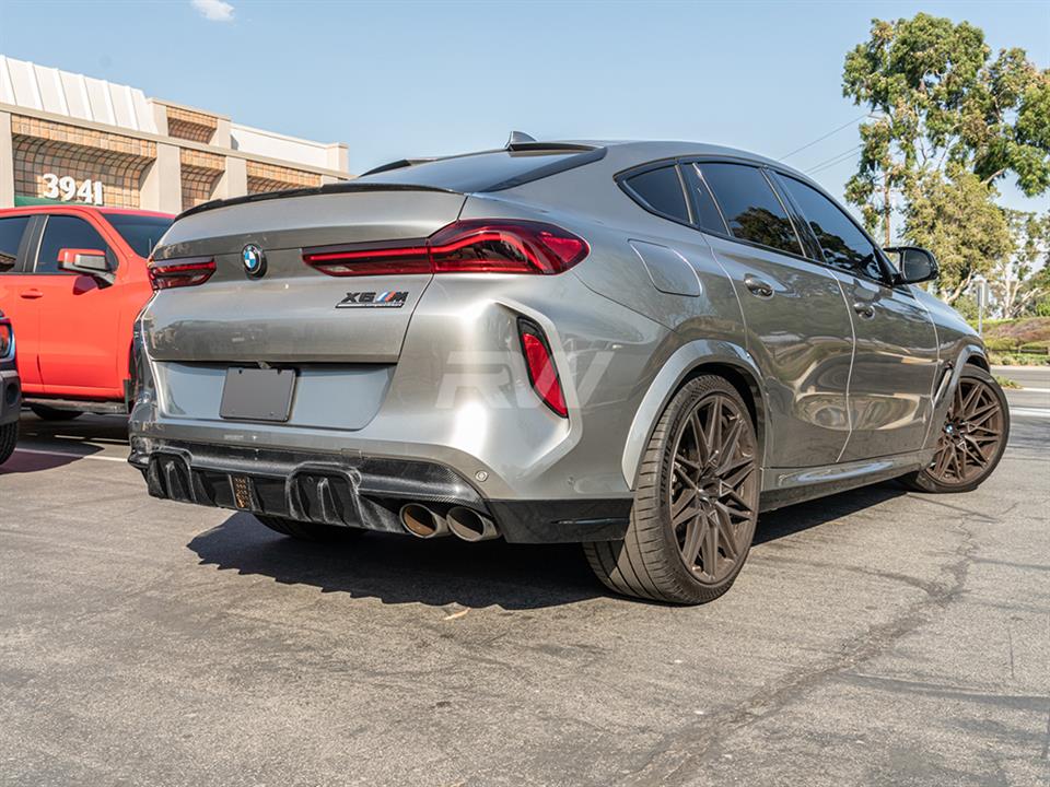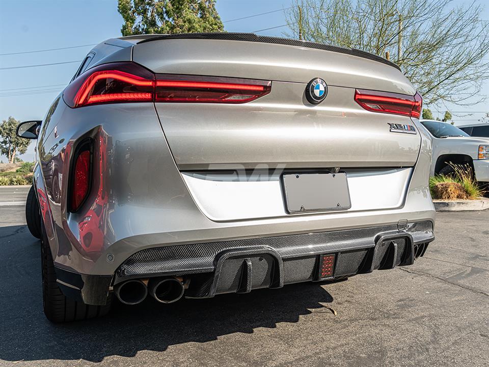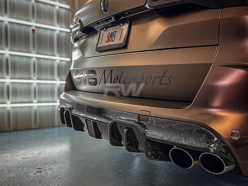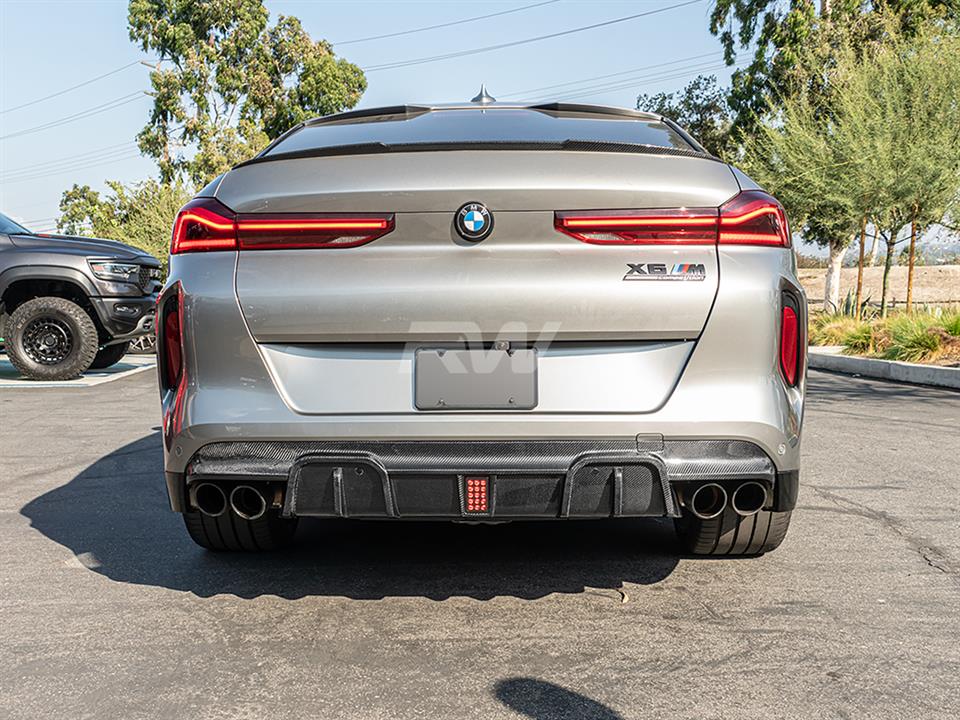 This BMW F95 X5M/F96 X6M Man Style Carbon Fiber Diffuser is a must have for all M owners looking to take their ride to the next level. It looks great installed all alone but looks best when paired with our other man style carbon fiber parts. This diffuser is hand crafted using high quality materials for a beautiful looking product that will last and will fit great. This diffuser is also covered in a UV-resistant clear coat to ensure a strong and lasting shine. The rear bumper must be removed for installation. For added styling and bespoke design, this diffuser also incorporates an LED light. Our man style diffuser is also available in forged carbon. If interested, please contact us. Reference photos below.