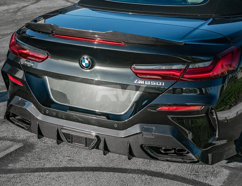 RW Carbon brings a new carbon fiber rear diffuser for your BMW G14 G15 840i M850i 8-Series. This Full Carbon Fiber Rear Diffuser with integrated LEDs provides an intense and aesthetic visual upgrade to the back side of your BMW that’ll be sure to turn heads. Made with 100% genuine dry carbon fiber, you can expect a more durable and higher quality part. Each and every one of our pieces including this full carbon fiber rear diffuser is built using only the highest quality carbon fiber material while covered UV-resistant clear coat. Along with a top-tier product, it’s also backed by our fitment and quality guarantee to ensure that you are getting what you pay for each and every time. Please contact us if you have any questions about this BMW G14 G15 Diffuser.