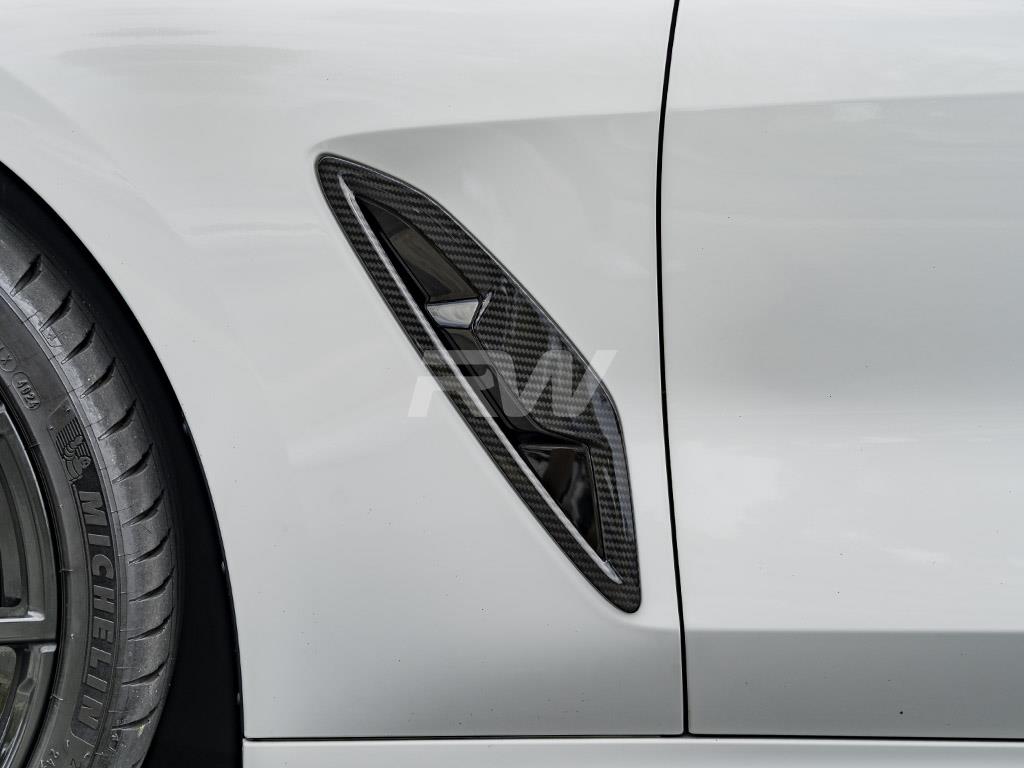 Add to your carbon fiber exterior theme with these new BMW 8 series carbon fiber fender trims. These are an overlay install with 3m tape and promoter. These are built using some of the highest quality 2×2 carbon fiber that money can buy. Our fender trims are made to match any other carbon fiber pieces already on the car. On top of these perks, they also come with a fitment and quality guarantee to ensure that you are receiving a high quality carbon fiber part. These fender trims will fit all G14, G15 and G16 8 series models including the 840i and M850i.