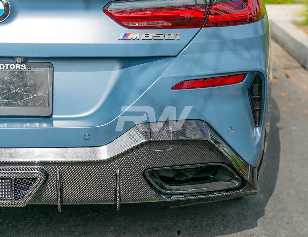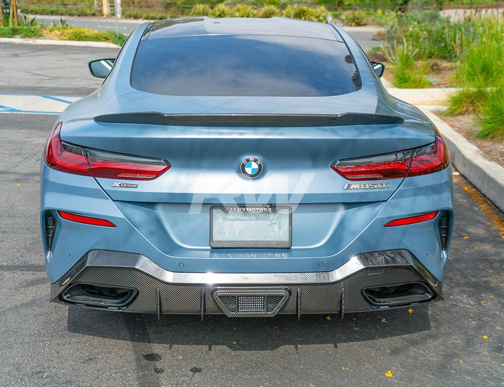 RW Carbon has created a new carbon fiber rear diffuser for your BMW G16 M850i 8-Series Gran Coupe. This BMW G16 8-Series Carbon Fiber Rear Diffuser with integrated LED provides an intense and aesthetic visual upgrade to the back side of your BMW. This is a very large diffuser and such it will drastically change the appearance of your BMW G16 gran coupe. When installing these diffusers the entire rear bumper will need to be removed so professional installation is recommended. Hand crafted from 100S% dry carbon fiber this diffuser is surprisingly lightweight for how large it is. After construction they are clear coated for a mirror like finish. It’s also backed by our fitment and quality guarantee to ensure that you are getting what you pay for each and every time.