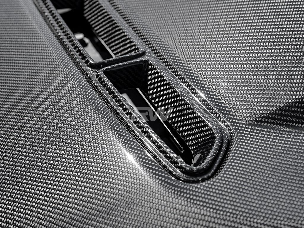Installation for the RW carbon fiber hood is quite simple, as it uses OEM mounting locations. Our hood also has OEM style studs, unlike some other options on the market which makes installation more difficult. Installation can be completed in around 2 hours and requires standard hand tools. If you need installation in Southern California, we can get it done for you!