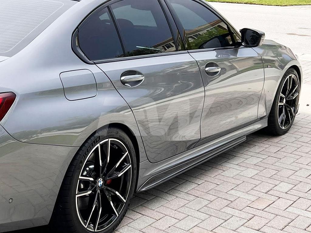 These Performance Style Carbon Fiber Side Skirt Extensions are the perfect addition for any 2019+ BMW G20 3 series owner. They are a great product to compliment your other CF parts from RW and will help to tie together your ground effects package. All of our carbon fiber at RW Carbon is backed by a superior quality and fitment guarantee to ensure that you always receive the best quality product that you can get on the market. Installation is fairly simple as it requires applying 6-8 self-tapping screws into the underside of your side skirts and it will be ready to hit the road. These performance style side skirt extensions are crafted using real carbon fiber and then clear coated for a high gloss finish.
