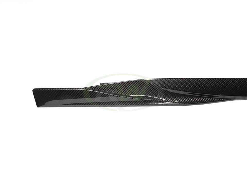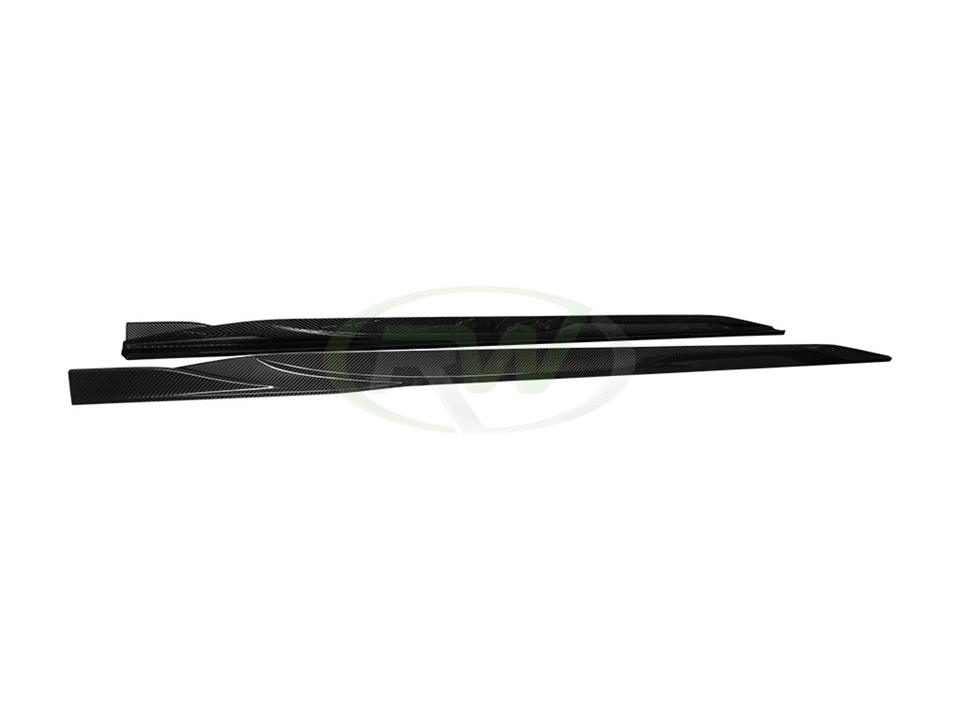 Professional installation is always recommended for RW Carbon’s products including these carbon fiber side skirt extensions. Installation requires self tapping screws and 3M tape along the top ridge. All these materials will be included. If you need further assistance, we have carbon fiber experts standing by.