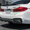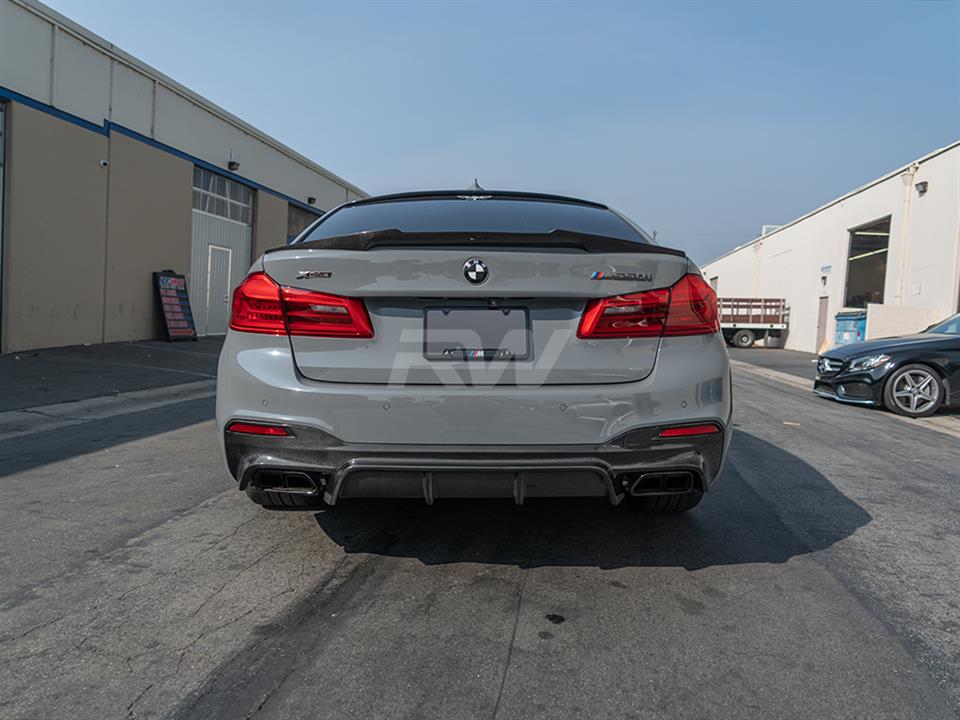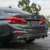 Are you tired of your bland and boring looking plastic diffuser that comes from BMW on your G30 5 series? Then you need to checkout this EC style carbon fiber rear diffuser. These fit all 2017-2020 5 series with the M Sport package, which includes the 530i 530e 540i and M550. This EC Style Diffuser is made using genuine carbon fiber and will perfectly match any other G30 RW Carbon Fiber parts and/or accessories. This diffuser does require the removal of the rear bumper for installation. Due to this we highly recommend that you have either us at RW Carbon install it or another professional shop. This diffuser allows the ability to use your OEM exhaust tips or an aftermarket exhaust with quad tips. Take your G30 from bland to extraordinary in a matter of a couple hours with a new RW EC Style Diffuser.