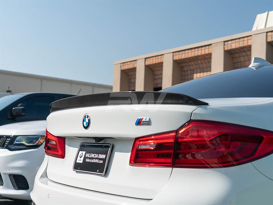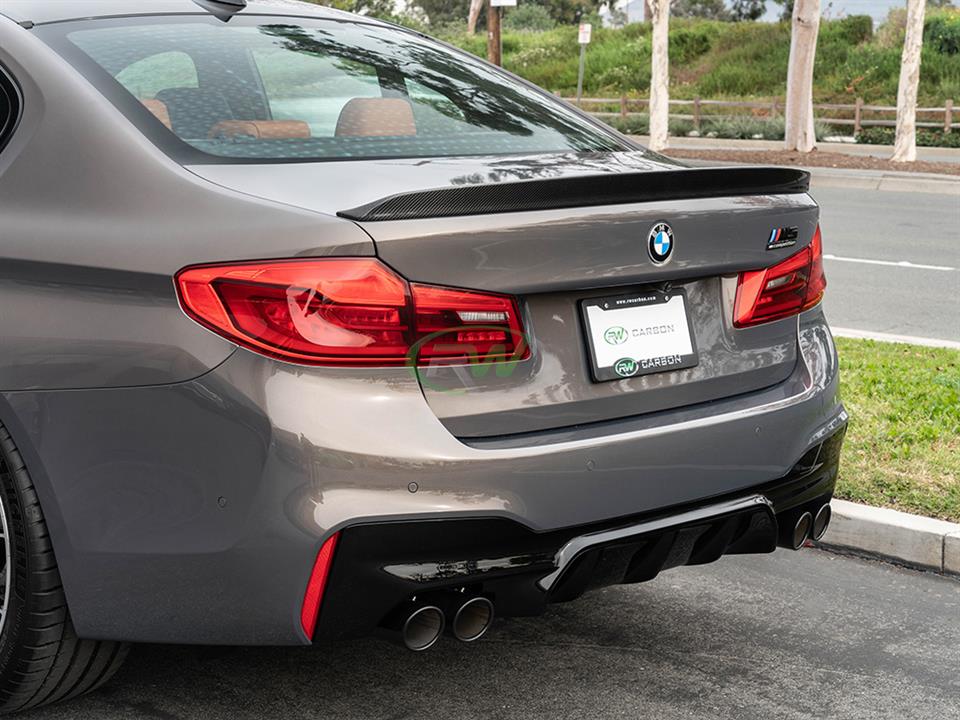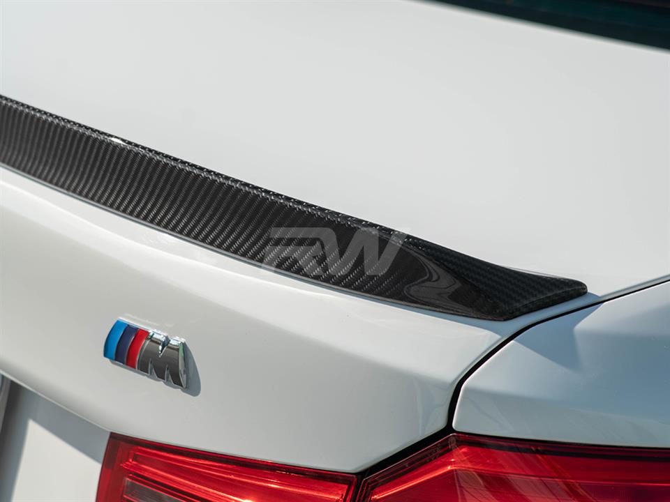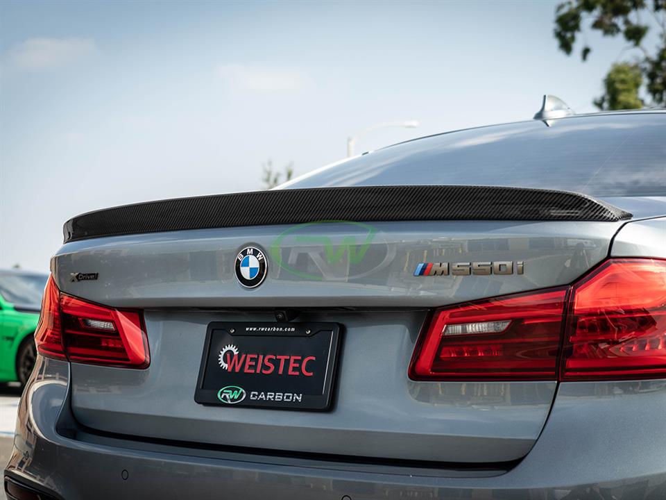 RW Carbon would like to introduce the 3D style carbon fiber trunk spoiler for the BMW G30 5-Series and F90 M5. It will fit all BMW G30 and F90 models including the 530i, 540i, 550i and M5. This spoiler is hand built using our 2×2 carbon fiber fabric so it will match all other RW carbon fiber products. The spoiler simply installs using 3M brand VHB double-sided tape and instantly gives you an improved appearance. Before we ship these trunk spoilers out worldwide we quality check each and every piece to ensure you receive a great looking 3D Style trunk spoiler for your G30 or F90. Each piece is finished with a clear coat that gives it that high gloss finish. If you have any questions about this G30/F90 3D style trunk spoiler, please contact us.