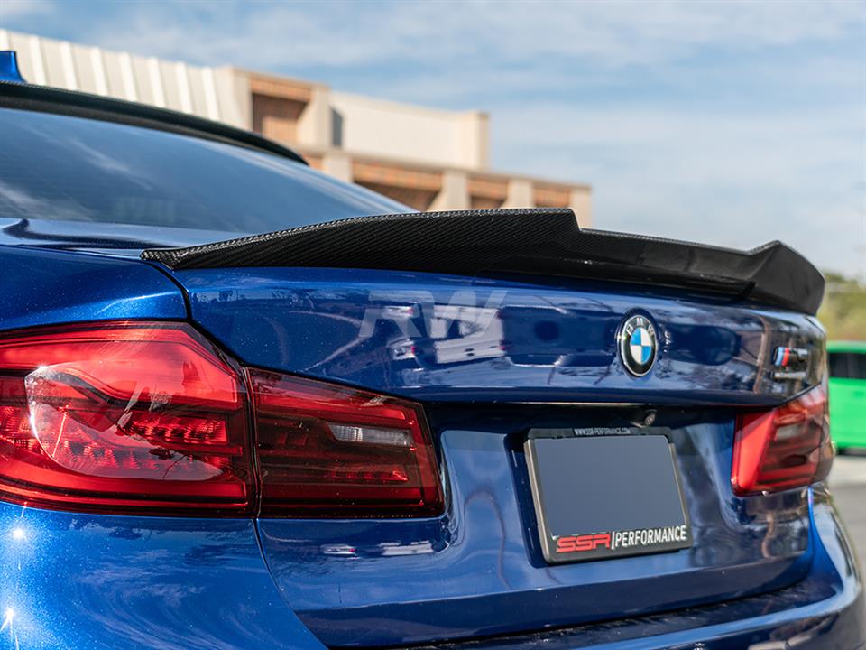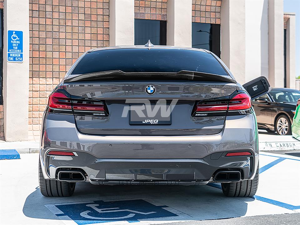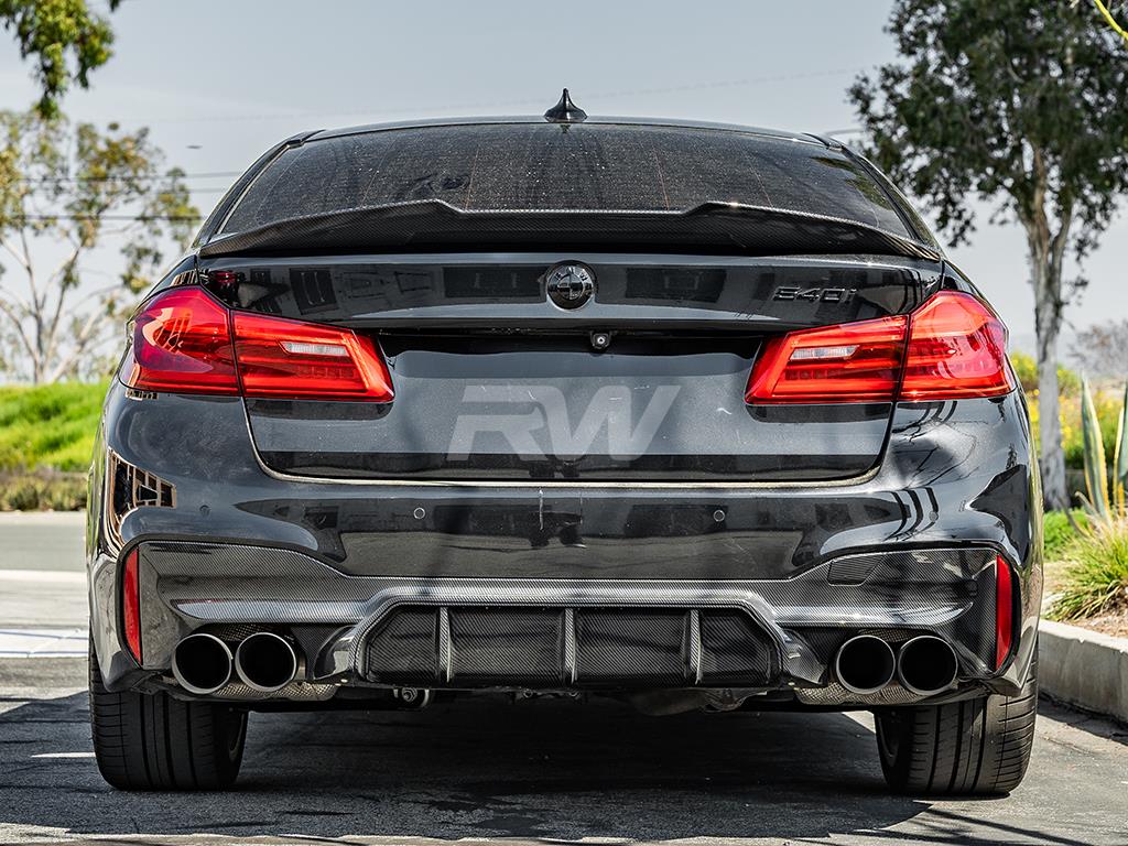 Upgrade the rear of your BMW G30 5-Series or F90 M5 with our new GTX Full Carbon Fiber Trunk Spoiler from RW Carbon. This spoiler is an aggressive addition and looks best paired with other aggressively styled RW Carbon fiber parts. Our GTX trunk spoilers for BMWs are some of our most popular styles due to its sharp lines and large appearance. This spoiler comes in our dry carbon fiber weave to ensure top tier quality and fitment. As always this spoiler is backed by our fitment and quality guarantee to ensure great fitment as well as a high quality part. Installation is made simple by using 3M tape which is strong and does not damage your trunk.