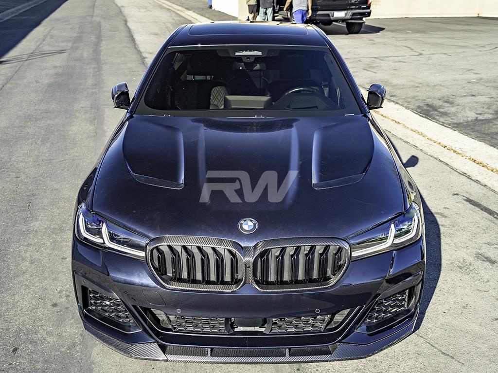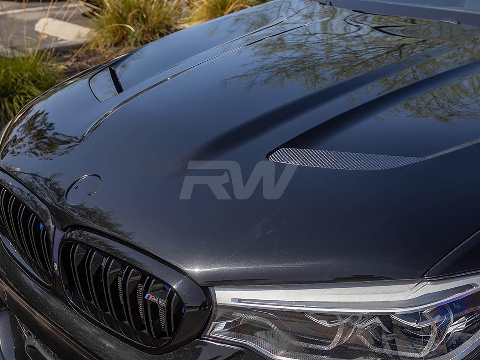 Come take a look at this CS style aluminum hood for your 2018+ M5 (LCI and Competition). This CS style aluminum hood gives our customers that same sporty design of our carbon fiber version, but without the hefty price tag. Each CS style hood is crafted from aluminum and will weigh similar to that of the OEM hood. This hood comes in 2 options; you can either have black vent covers or you can opt for our carbon fiber vent covers to match other RW Carbon parts. Our hoods come with studs built into the hood and mounts for all the factory accessories to make installation painless. If you have any further question or concerns about this CS hood for your G30 or F90 then please contact us.