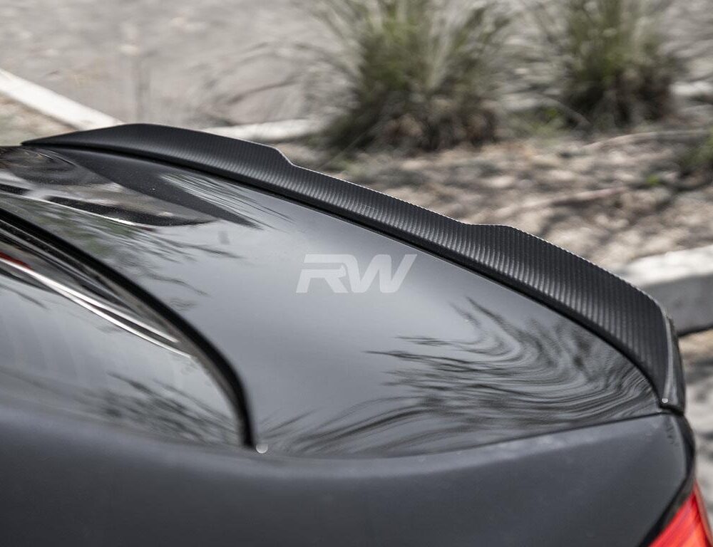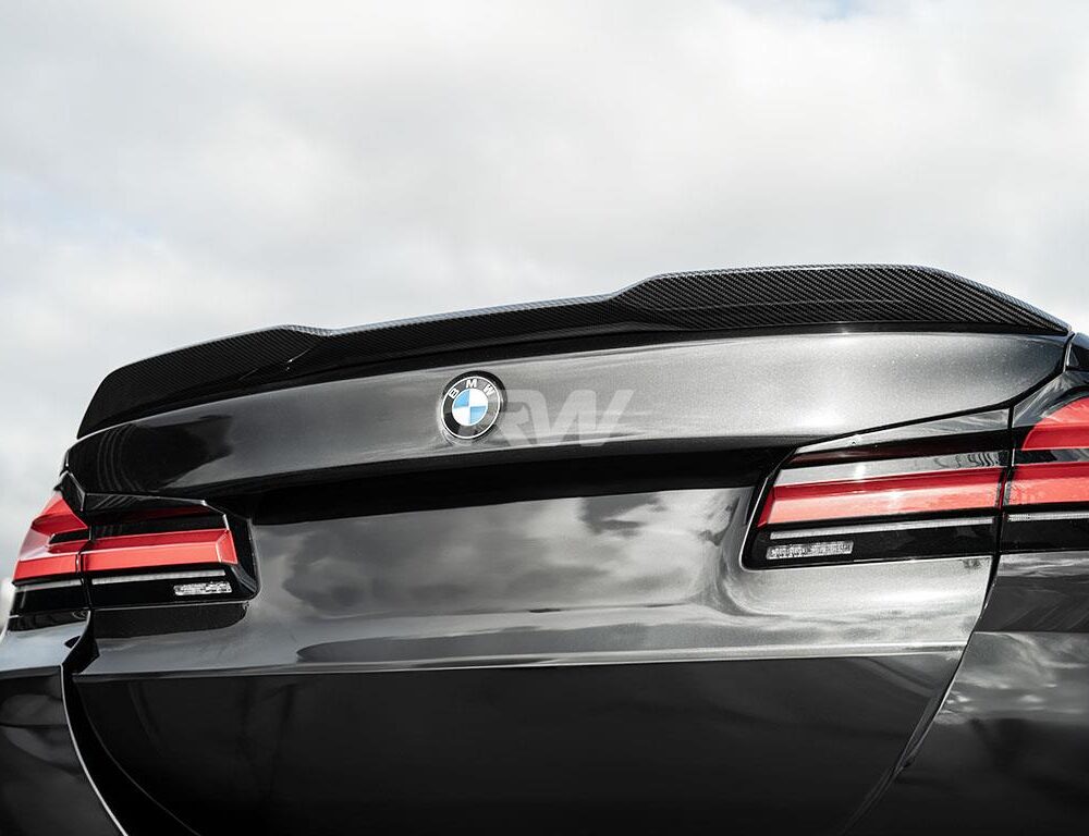 Here is another great trunk spoiler option for your BMW G30 5-Series or F90 M5. This performance style G30 and F90 M5 carbon fiber trunk spoiler features 2×2 carbon fiber weave that perfectly matches other RW Carbon or OEM parts that are on the vehicle. Installation for this spoiler is simple, just requiring 3M double sided tape (not included, but can be purchased at checkout). After manufacturing the spoiler we complete each one with a UV resistant clear coat which makes it easy to clean and will keep it looking great for years to come. This clear coat will also give it that high gloss finish. These will fit all 2017+ BMW G30 530, 540, 550 models including the 2018+ BMW F90 M5. When you choose RW Carbon you will receive a spoiler that is free from defects and comes ready to install on your BMW.