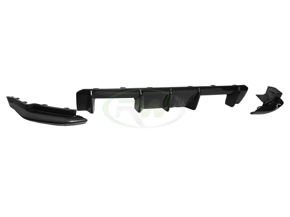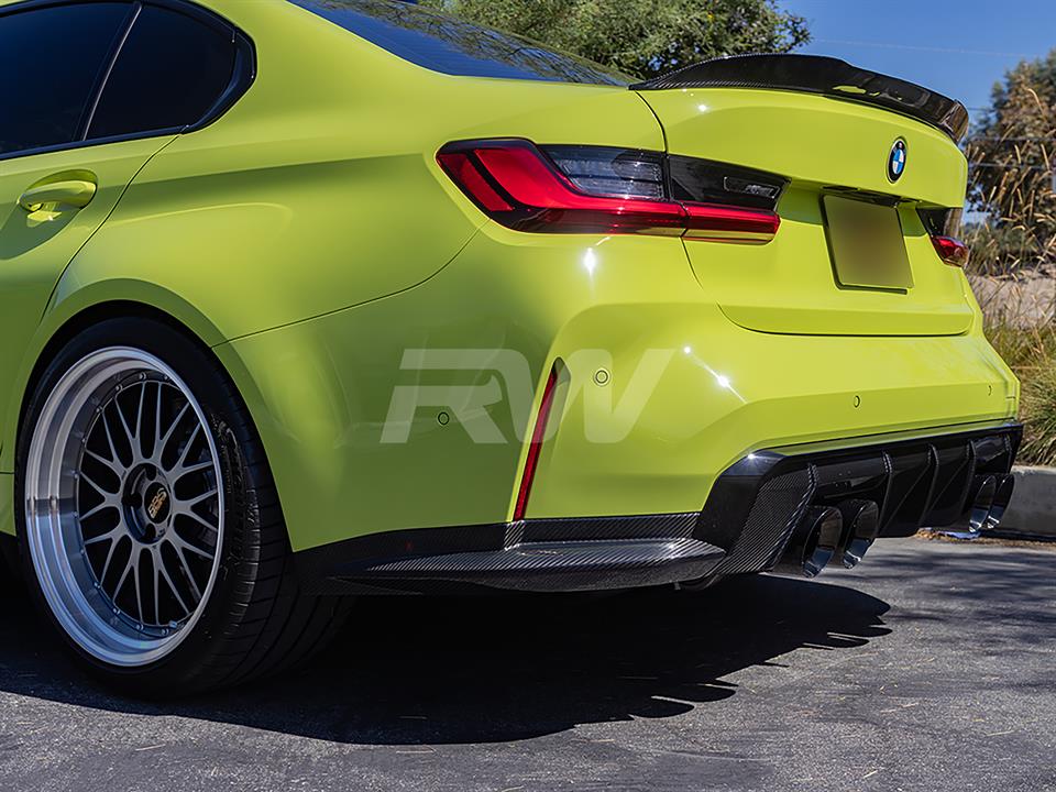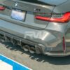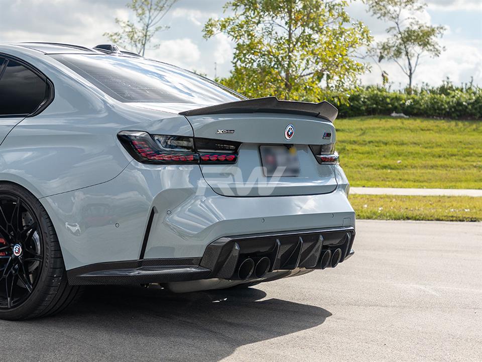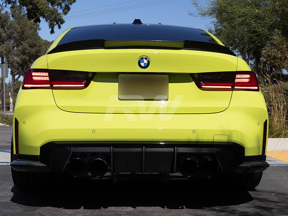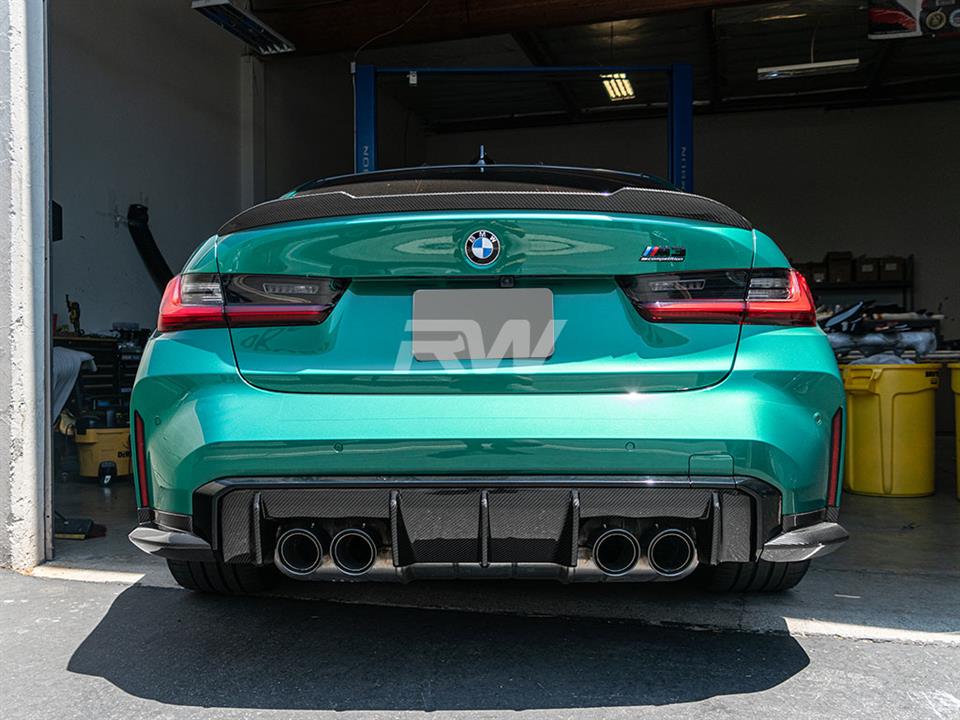 This 3-piece 100% carbon fiber rear diffuser is the perfect item to begin or complete your carbon fiber aero kit for your BMW G80 M3. This diffuser is constructed with high quality full carbon fiber 2×2 weave construction and then clearcoated for a high gloss, showroom finish. Installation is simple and only takes about 1 hour at a professional shop. This full carbon fiber diffuser fits all 2021+ BMW G80 M3 applications and comes with our fitment and quality guarantee. Prior to shipping, we quality check every last G80 diffuser one last time to make sure you are receiving a beautiful looking product that is free of defect. If you have any questions regarding this OEM style CF diffuser for your G80 please contact us.