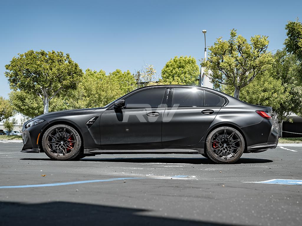 Opt for our new OEM-style full carbon fiber side skirt extensions if you’re looking to add some carbon fiber to your BMW without drastically altering its appearance. We handcraft each set of these G80 M3 carbon fiber side skirt extensions with 100% dry carbon fiber and complete them with a UV-resistant clear coat to ensure they do not fade or discolor over the coming years. Installation can be completed by any professional and directly replaces your gloss black factory skirts, without any modifications. Want to step it up even further? These side skirts are compatible with our RWS Side Skirt Extensions to give you the most aggressive styling possible. Get a high-quality and great-fitting set of OEM-style carbon fiber side skirts through RW Carbon today!