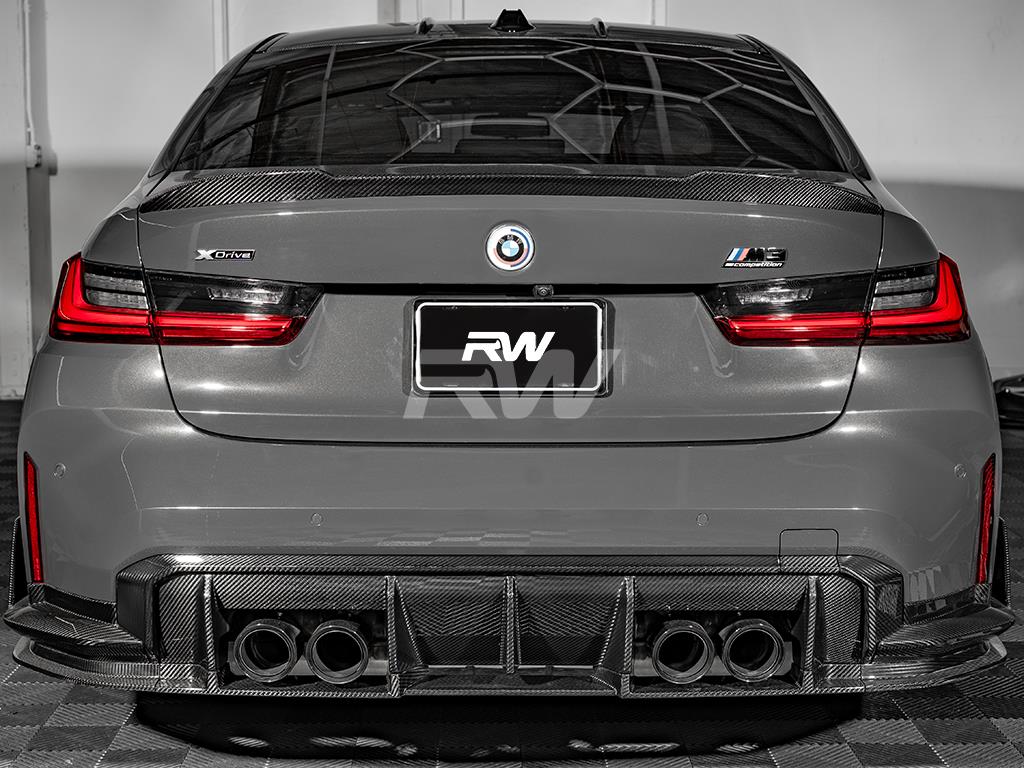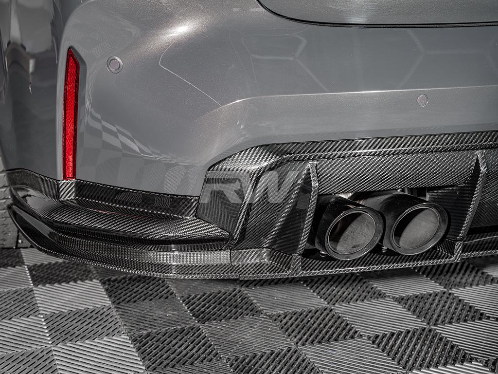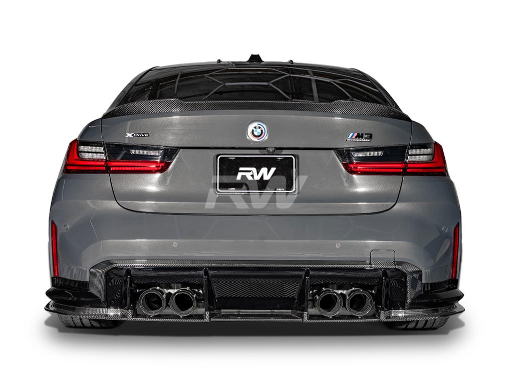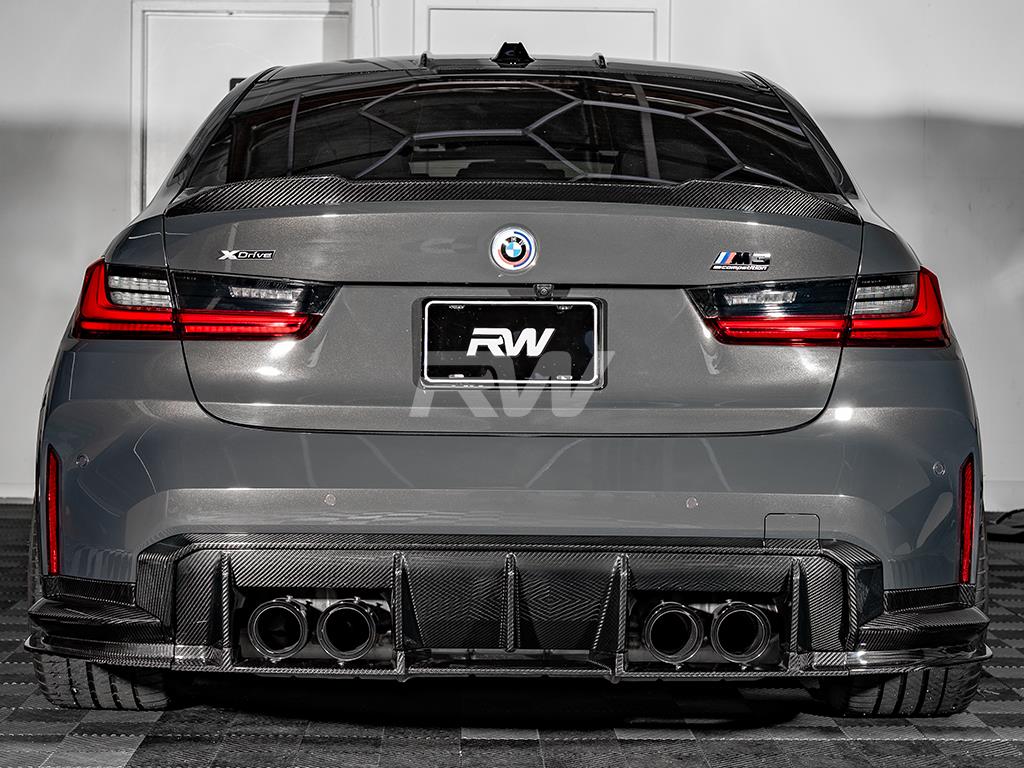 Enhance the rear style of your 2021+ G80 M3 with this sleek 3-piece RWS Dry Carbon Fiber Lower Diffuser. Designed to give your rear end a sporty flair, pairing perfectly with any other carbon fiber parts you may have on your G80. Made with genuine 2×2 carbon fiber weave and finished with a clear coat to prevent damage over time, our lower diffuser is both stylish and durable. Installation is straightforward, using screws to attach just below the factory gloss black diffuser and rear bumper splitters as well as our BMW G8X M3 M4 Carbon Fiber Outer Diffuser Trim and our BMW G80 M3 OEM Style Carbon Fiber Diffuser. If you have any questions regarding this G80 M3 RWS Carbon Fiber Lower Diffuser, feel free to call.